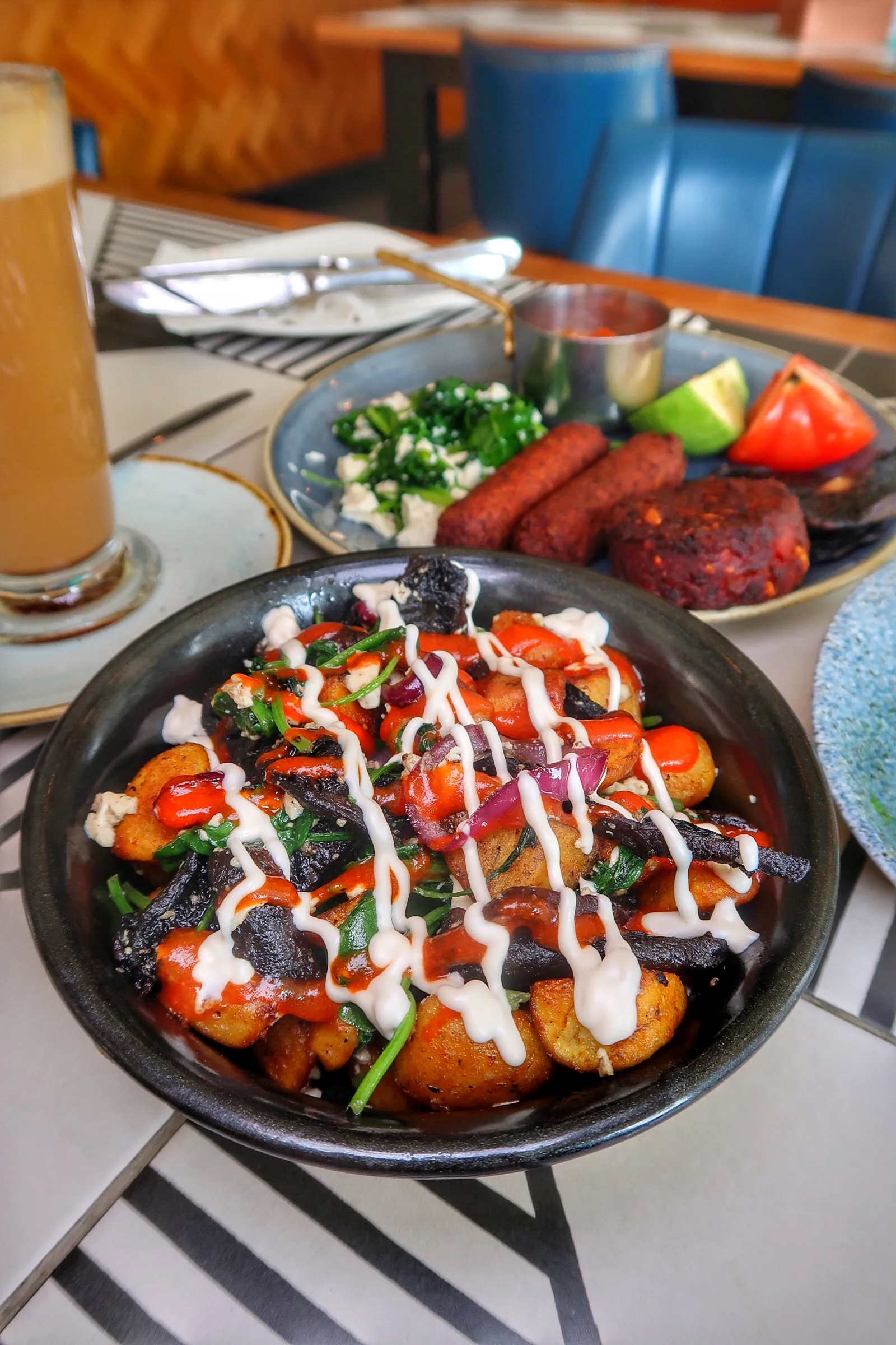 ✏️ The tofu needed to be scrambled more – wasn’t the right texture. It also needed seasoning and more flavour. The sausages had a nice flavour but were a little overcooked. I liked that the chickpea dish was a bit different. The tomato flavour was nice but they were slightly too watery. I liked the flavours in the hash, especially the seeds & nuts but ours was a bit overcooked. The avocado would’ve been better if it had come mashed with some lemon / salt / pepper. The mushrooms were far too salty – I would’ve loved some garlic flavouring! Would’ve liked the tomato to be cooked.