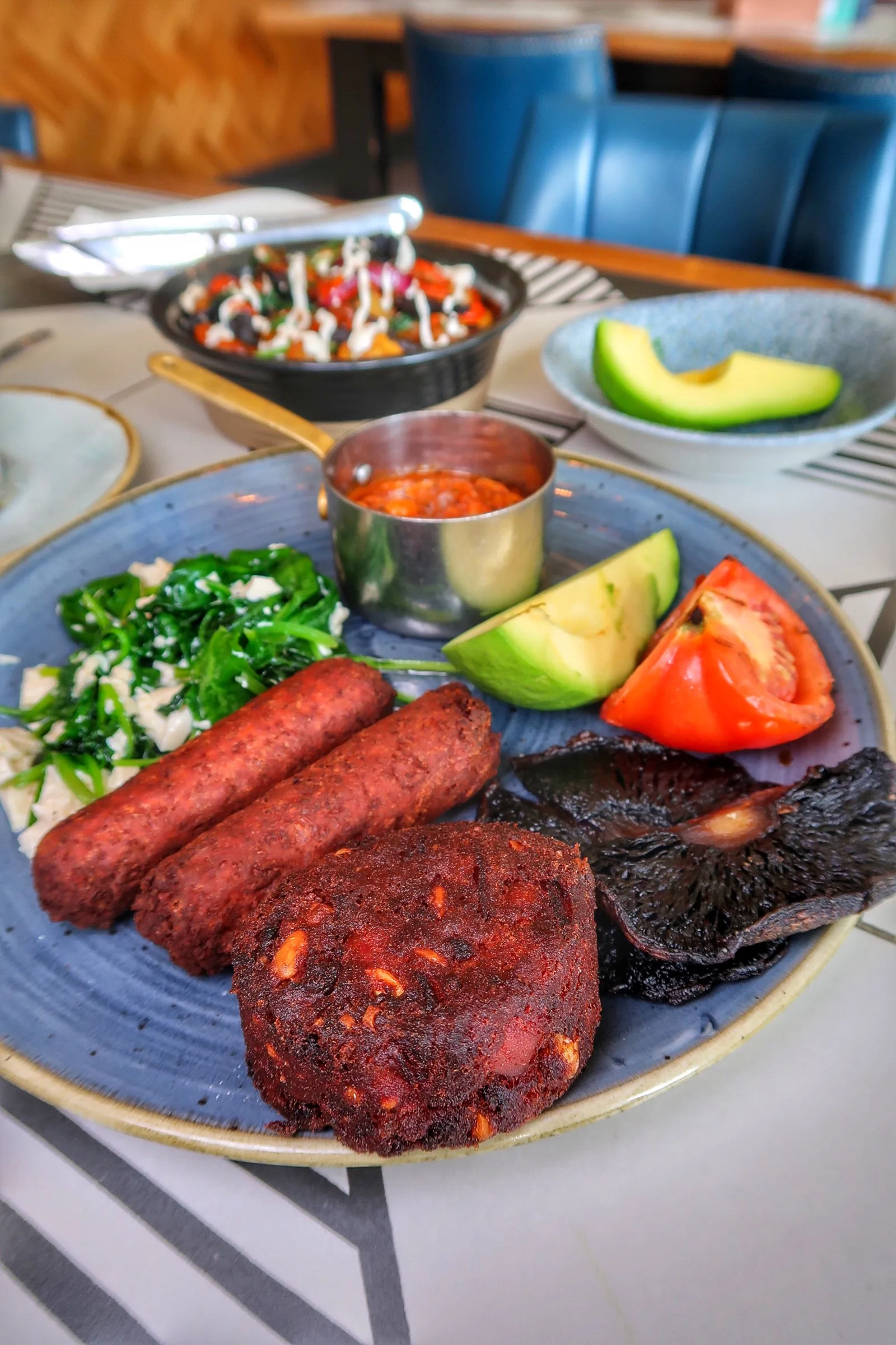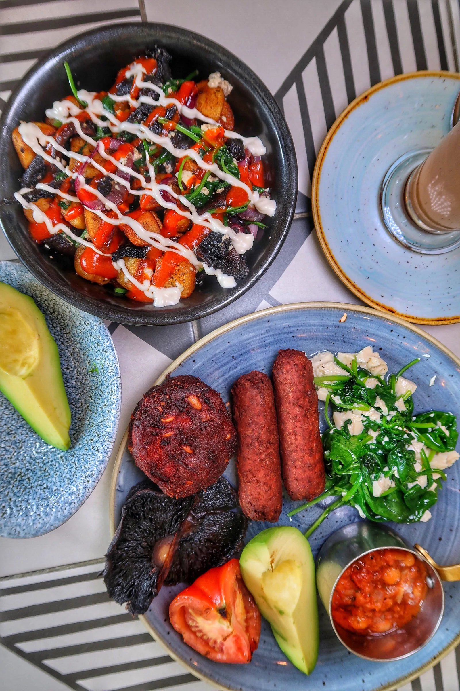 🌱Vegan breakfast w/ scrambled tofu & spinach, vegan sausages, tomato & chickpea stew, roasted mushroom, avocado & beetroot hash