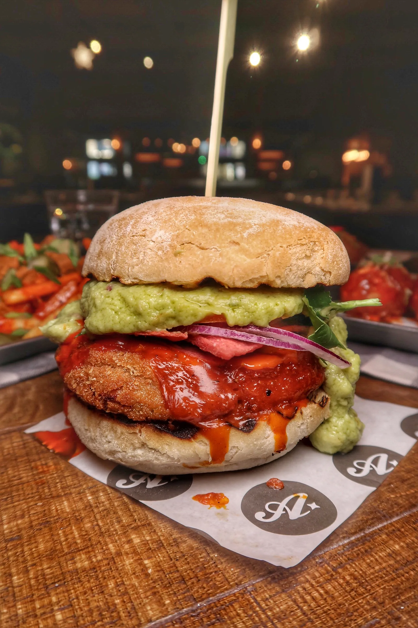 🍔 El Jackitan burger w/ breaded jackfruit patty, fresh guac, beef tomato, pink tortilla chips, sliced red onion, maple chipotle hot sauce, torn coriander & nacho cheeze