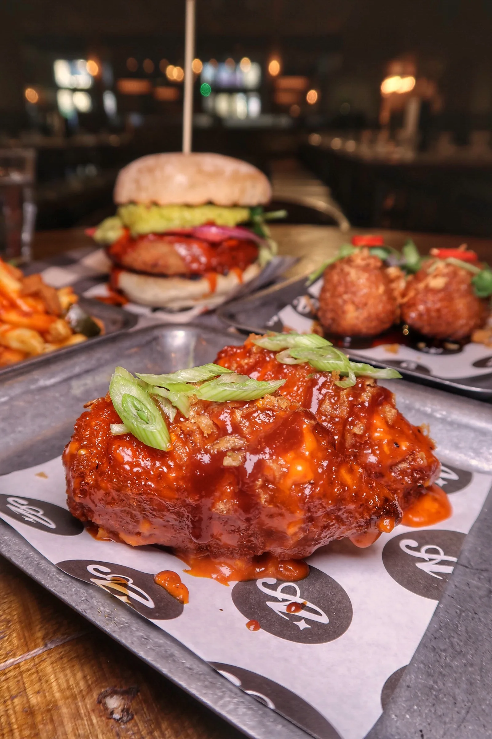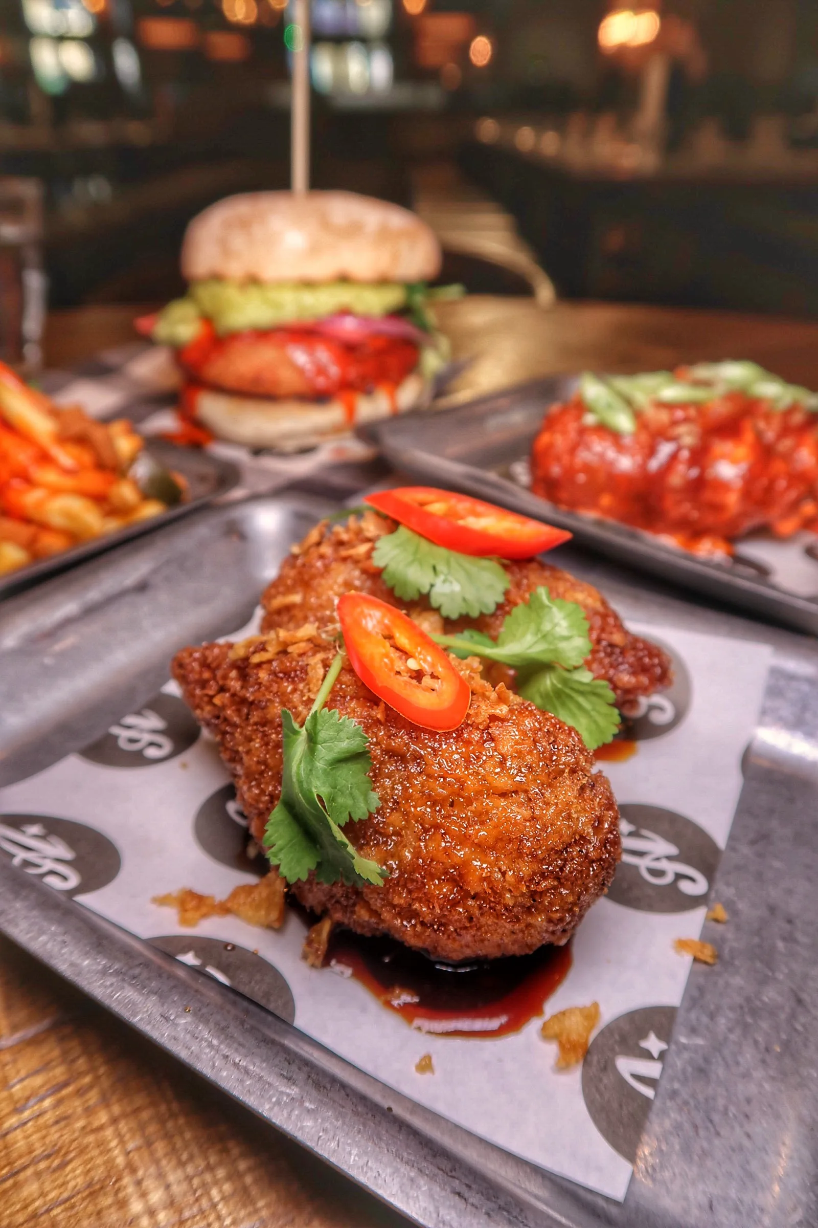 🍗 Soyz In The Hood jackfruit “chicken” wings with sticky maple syrup, soy, ginger & garlic glaze, red chilli, crispy onions & coriander .