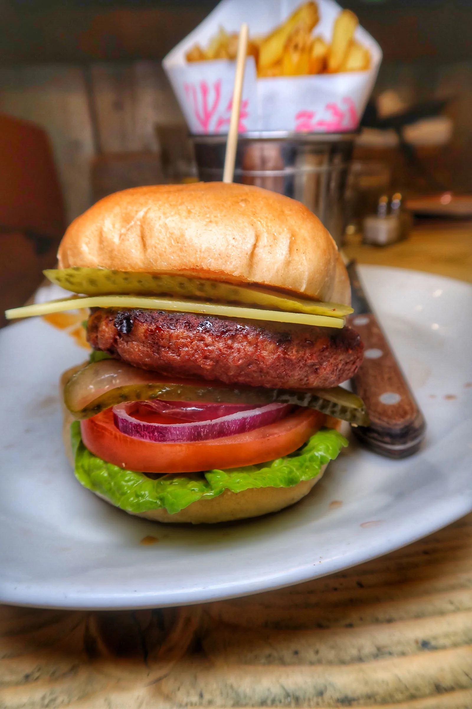 🌱 The @movingmountainsfoodsburger 🍔 with a MM patty, lettuce, tomato, red onion and mayo on a bun served with fries