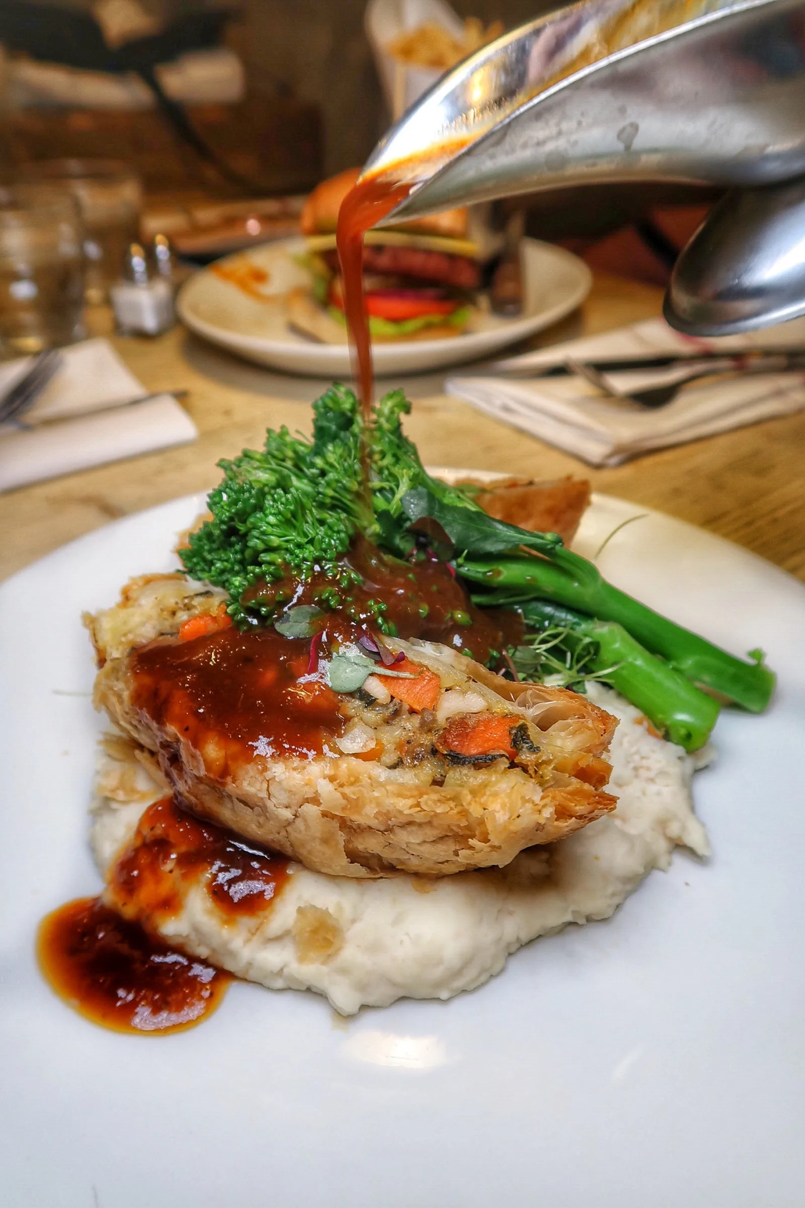 🌱 Bill’s Wellington made of carrot, cashew nuts, & mushrooms with butterbean mash, tenderstem broccoli & rich vegetable gravy