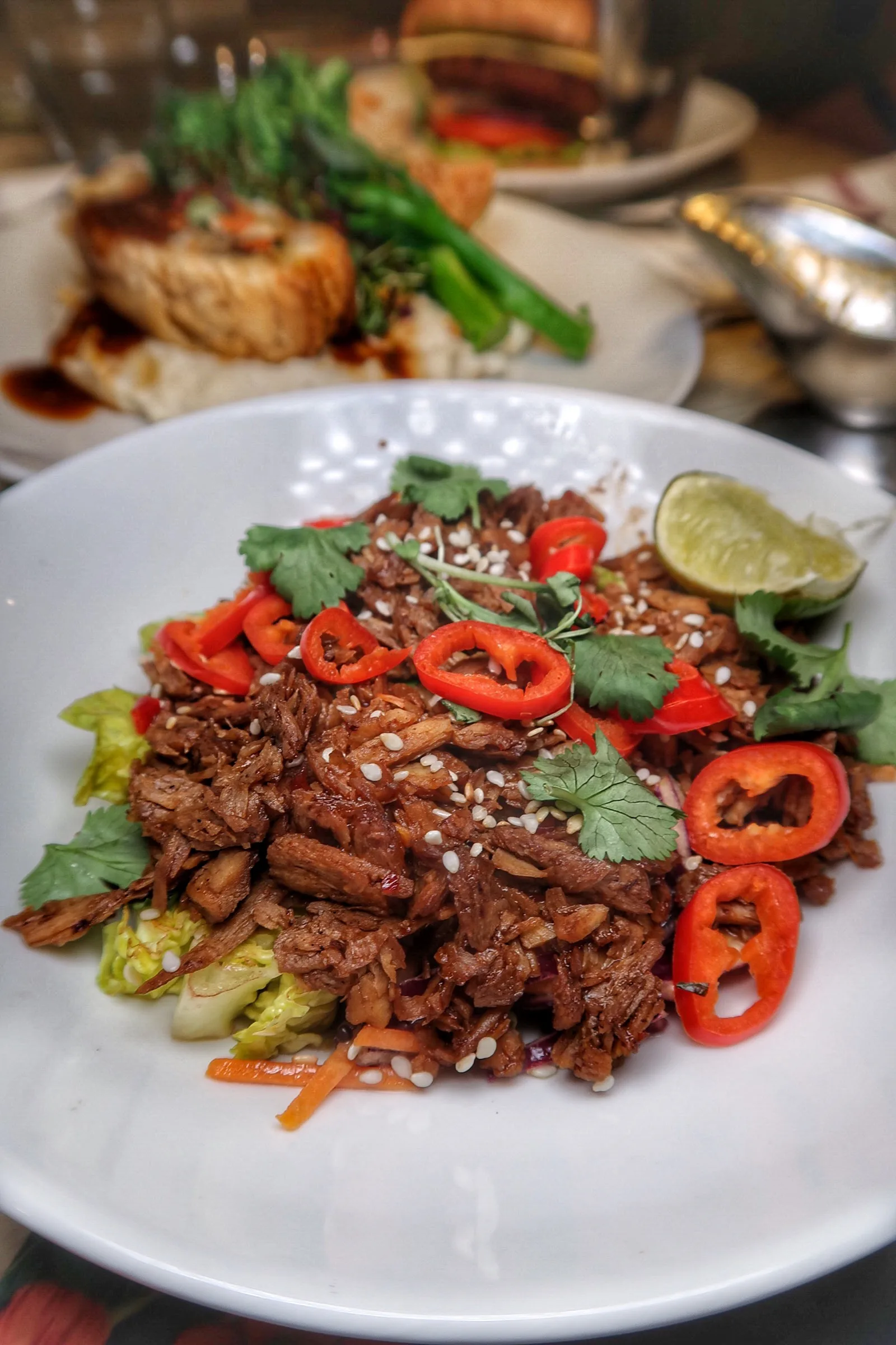 🌱 Vegan duck salad w/ chilli, coriander, spring onions, cucumber, carrots, cabbage & baby gem tossed in a miso dressing w/ sesame seeds & lime