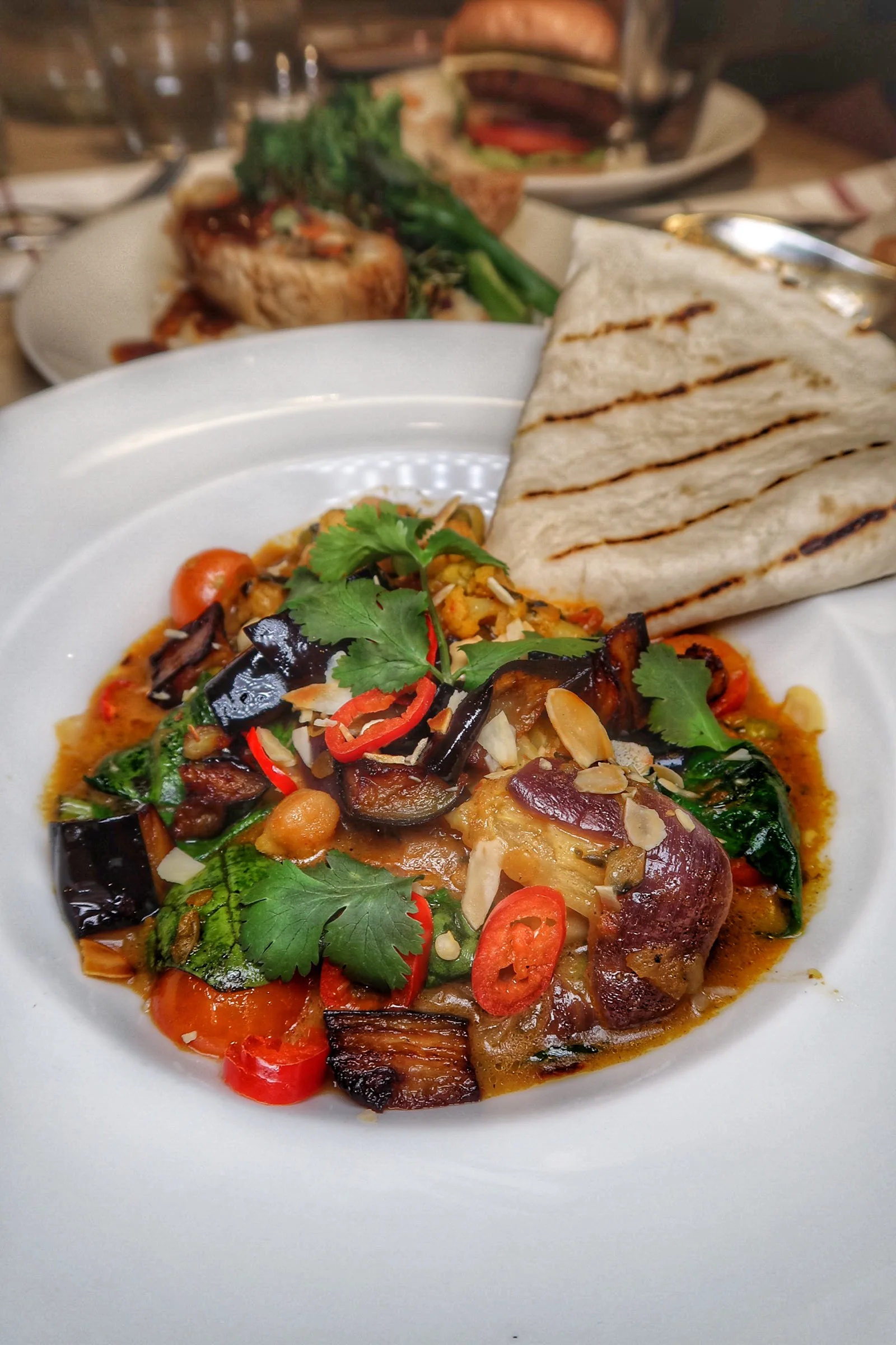 🌱 Aubergine & lentil dhal w/ cherry tomatoes, coriander, toasted almonds & grilled flatbread