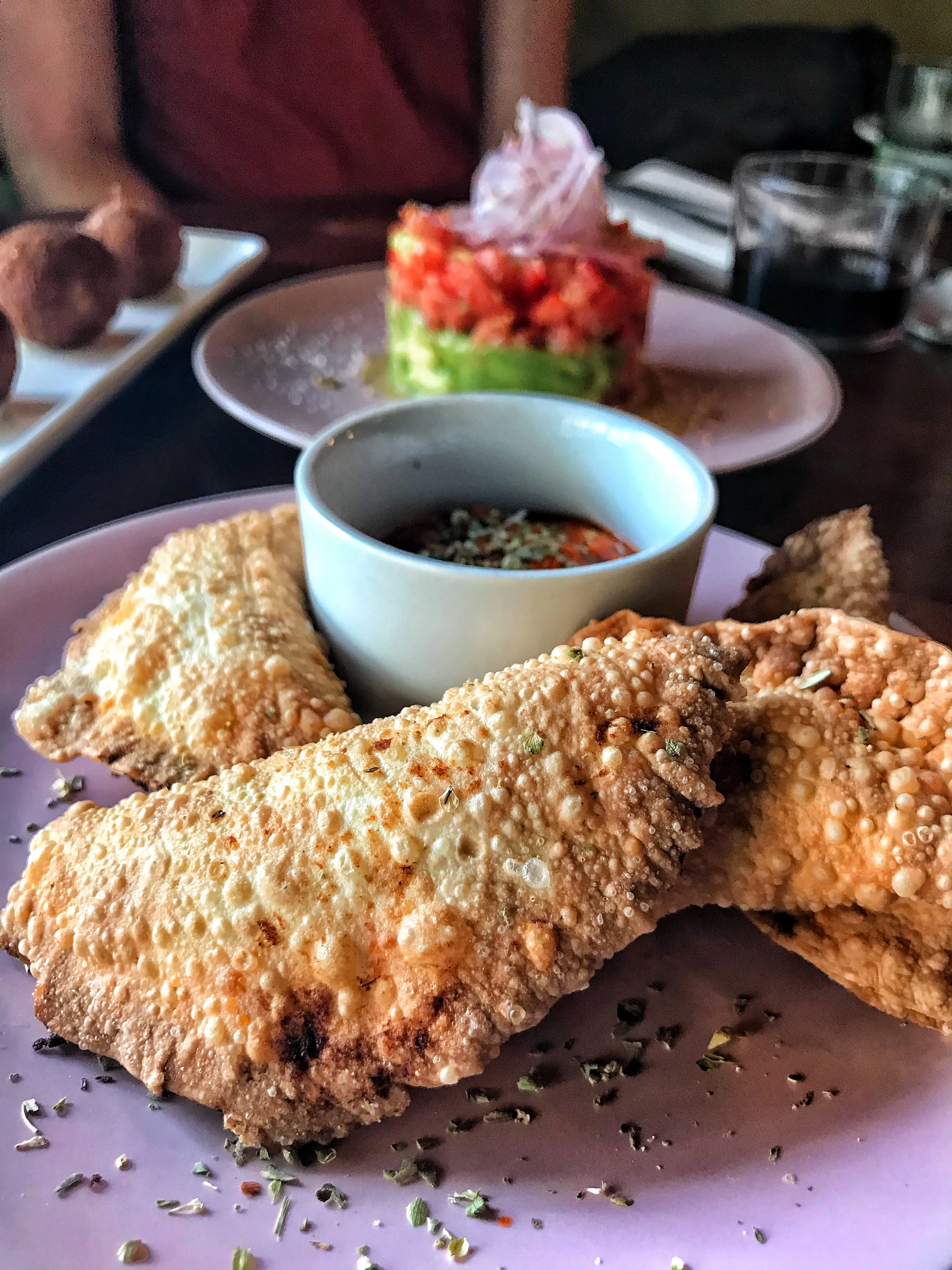 🍅 Empanadillas – Vegan pastries stuffed with ratatouille and a soya yoghurt mint sauce. Light, crispy and bursting with sweet tomato flavours