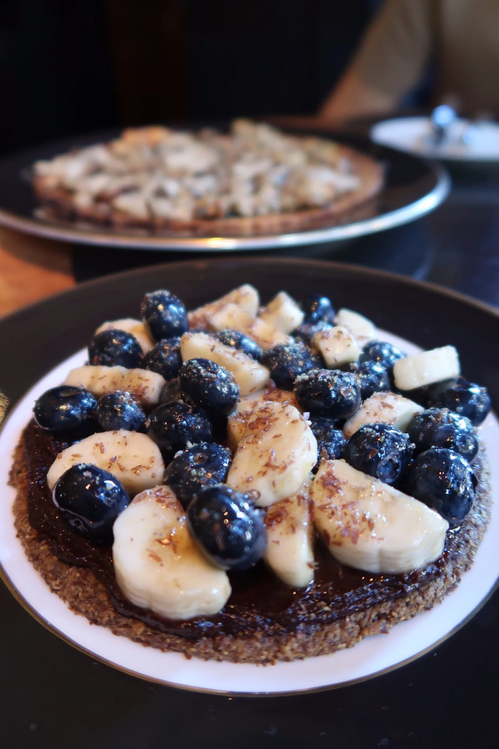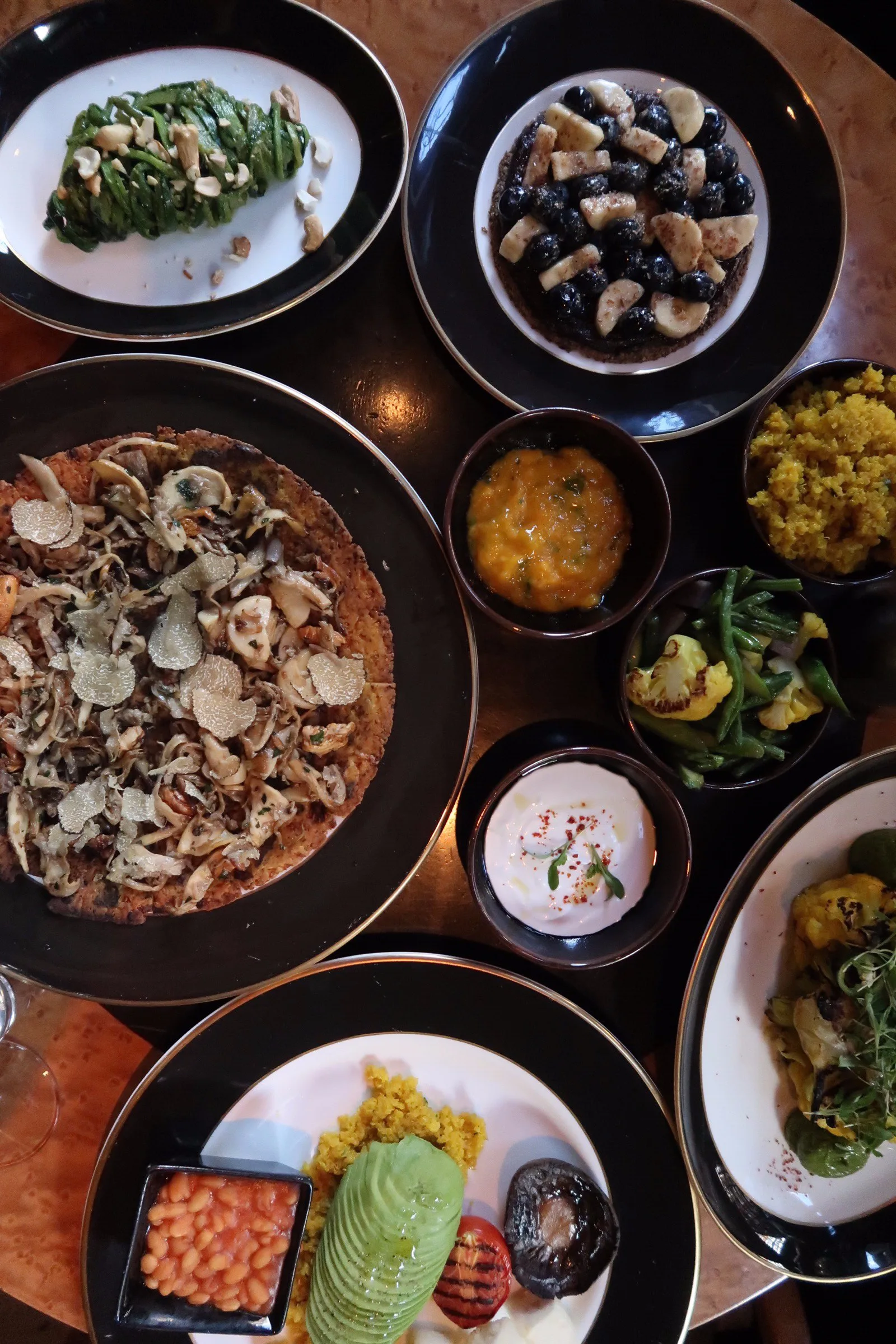@jolley_chris and I tucked into the wild mushroom and truffle pizza on a cauliflower, hemp seed & hazelnut base (tasty but tough) 🍕 coconut saffron curry with parsnip, purple potatoes, asparagus & yellow quinoa (scroll for review) 🍛 cauliflower steak with salsa verde, tahini & turmeric (flavours were a little bitter for me), vegan breakfast with tofu, quinoa, mushrooms, avocado, beans & tomato (scroll for review)🍴 flax seed biscuits with vegan Nutella, banana & blueberries (not bad) and the courgette spaghetti stir fry which the chef made with basil, tofu (instead of ricotta) & cashew nuts – Delicious! 🤤