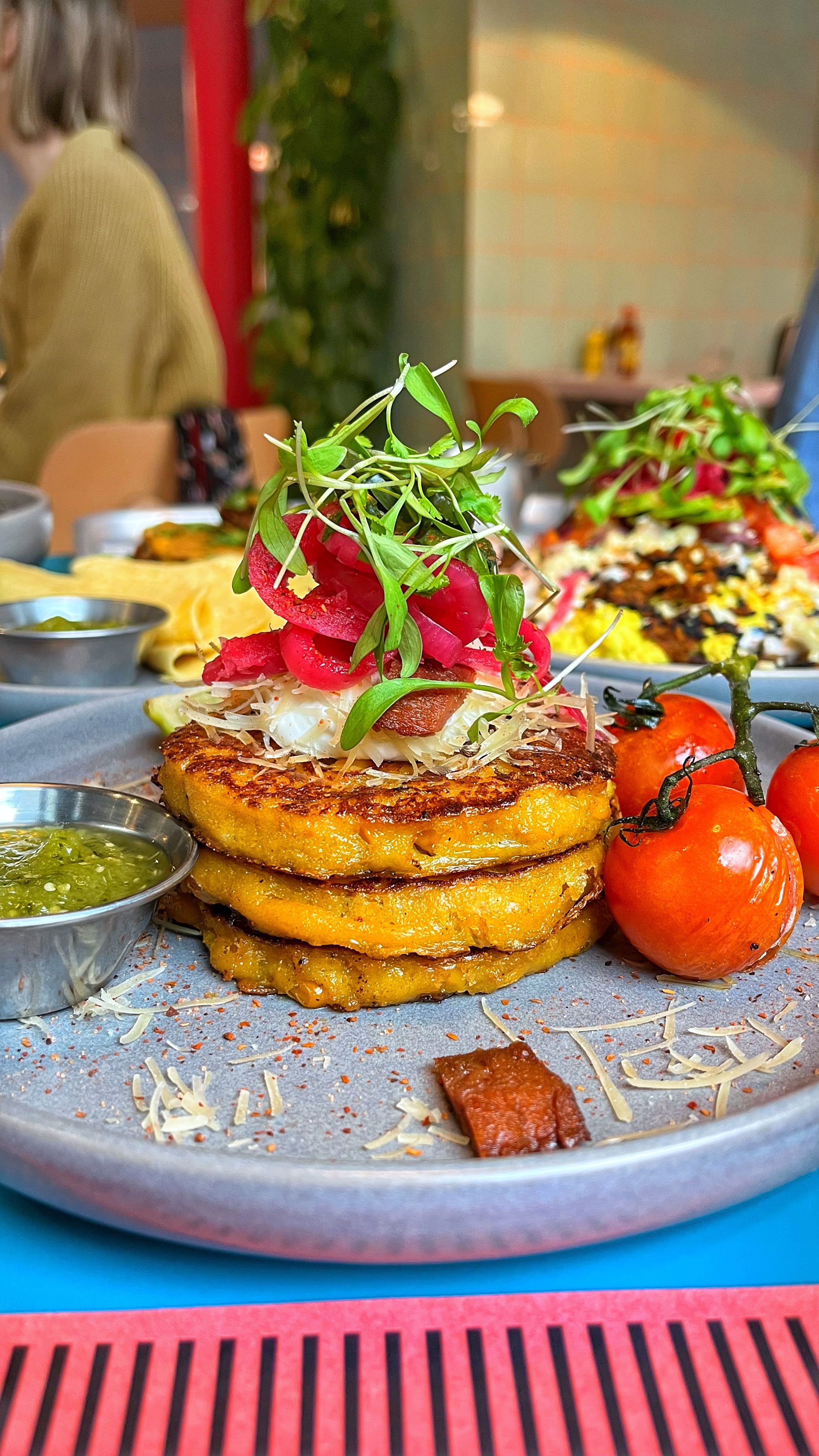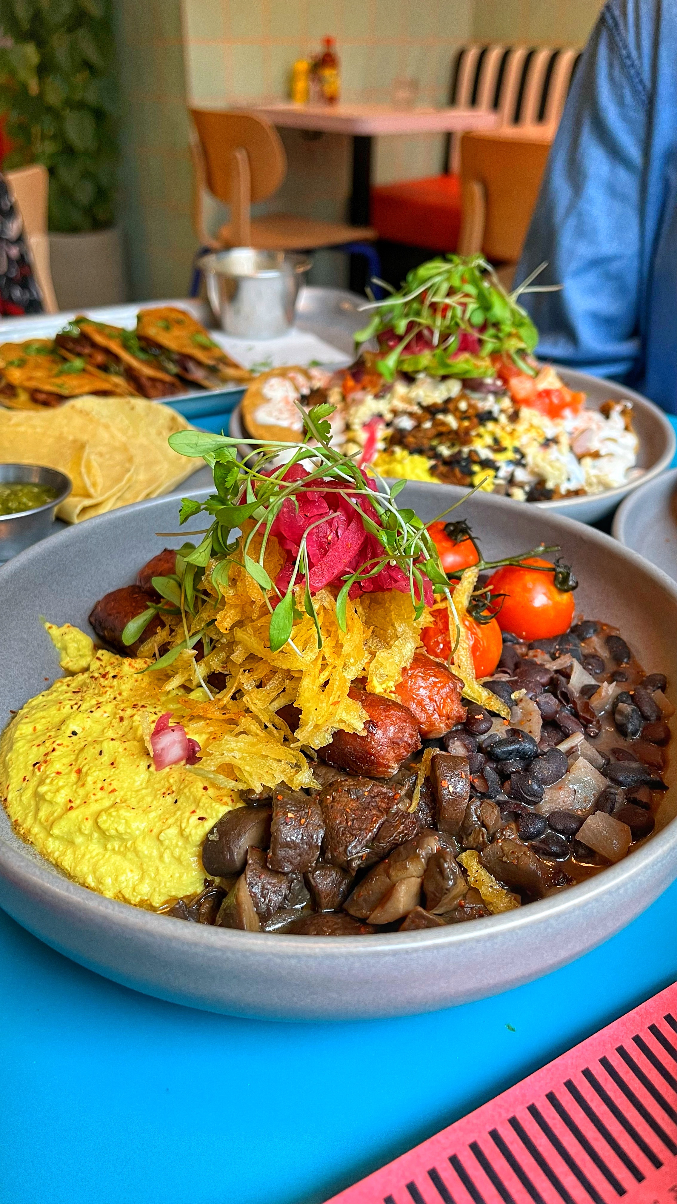 💭 It is so refreshing to find a vegan brunch in London that’s flavoursome, hearty and creative. Club Mexicana have nailed this. The Birria tacos were mine and my friends’ fave dish. I absolutely loved them! I thought the corn fritters were nice but a little cakey. The chilaquiles was so tasty – such a delicious sauce. Really liked the huevos rancheros and the fry up! So much flavour. Perfect examples of vegan breakfasts done well. The “chicken” with the waffles was a tiny bit dense for me. Really enjoyed the mexshuka and thought the avo toast was tasty! The venue has been decorated so well – it’s funky, bright and there was a really nice buzzy atmosphere when we visited. Also, shout out to the staff because the service was impeccable! This is a really great spot and deffo where I’ll be bringing friends for future brunches. Love ya, Club Mexicana!