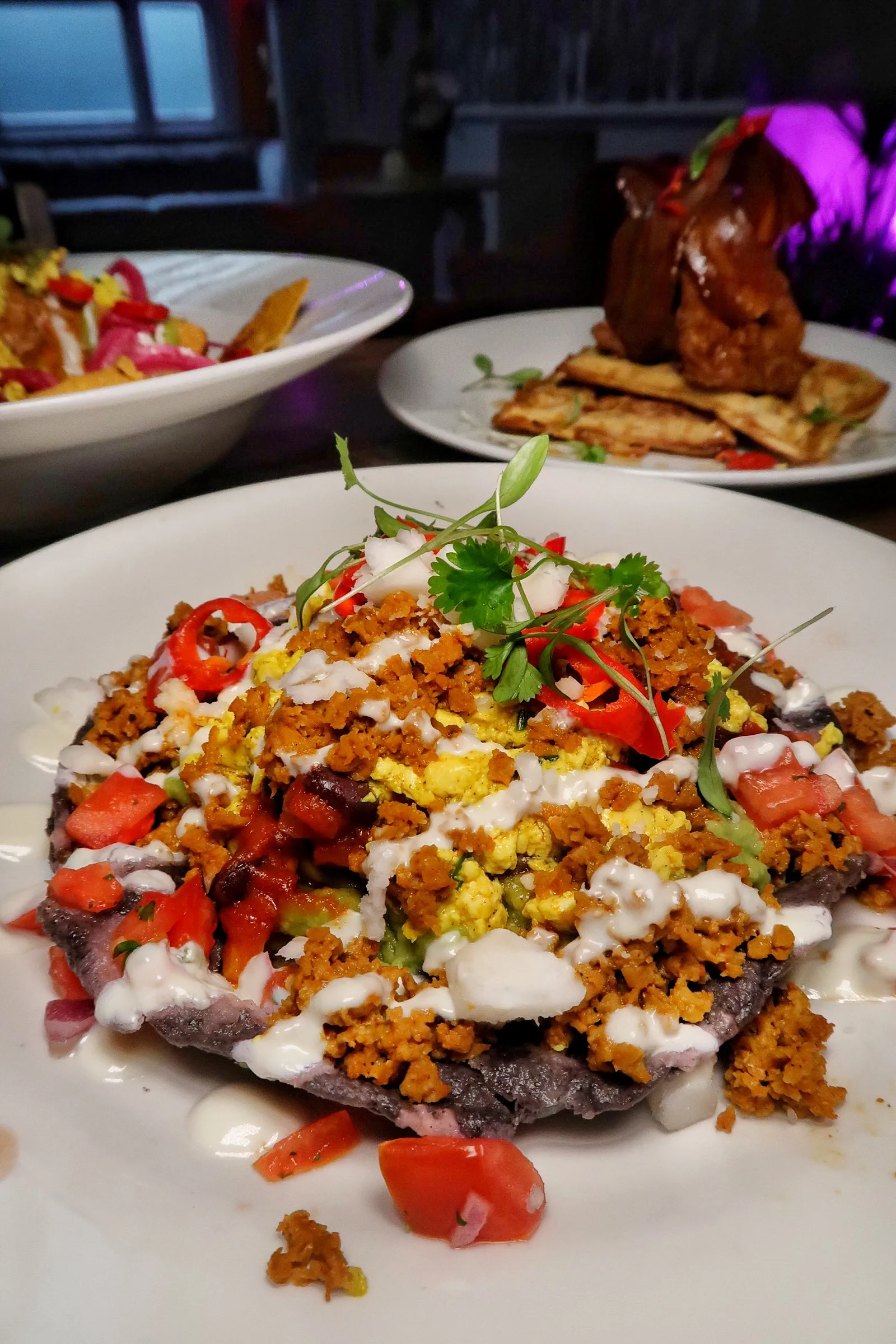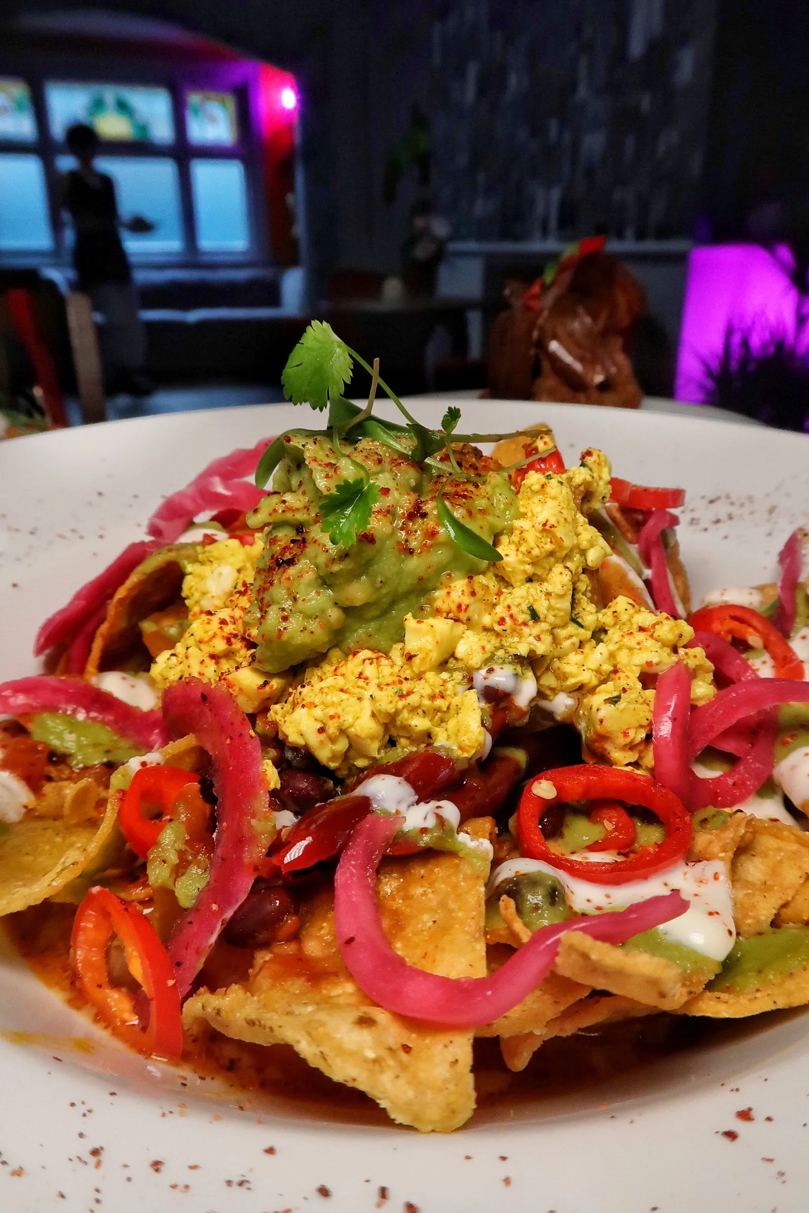 🌱 Chilaquiles with corn tortilla chips, ‘queso’, salsa verde, black beans, avocado, sour cream, pink onions, scrambled ‘eggs’ and pink chillies (my dish of the day) (GF)