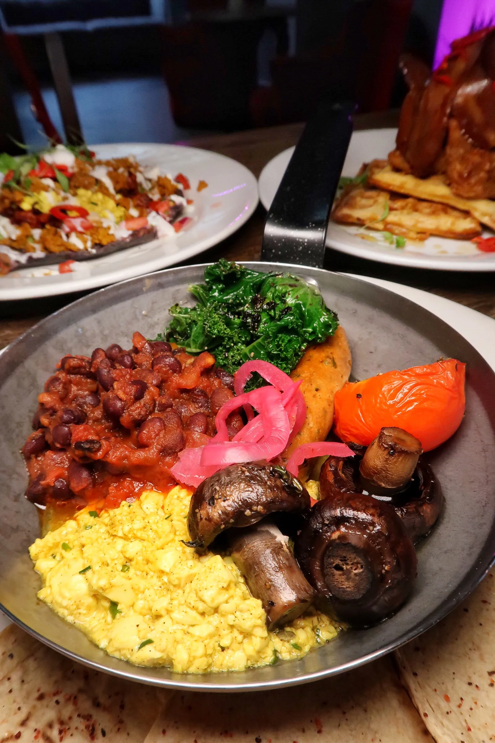 🌱 Mexicana Fry Up with scrambled ‘eggs’, a ‘chorizo’ sausage, tempeh ‘bacon’, black beans, roasted mushrooms, charred tomatoes, roasted mushrooms, sautéed lemon kale, pink onions, salsa verde & toasted corn tortillas (GFO)