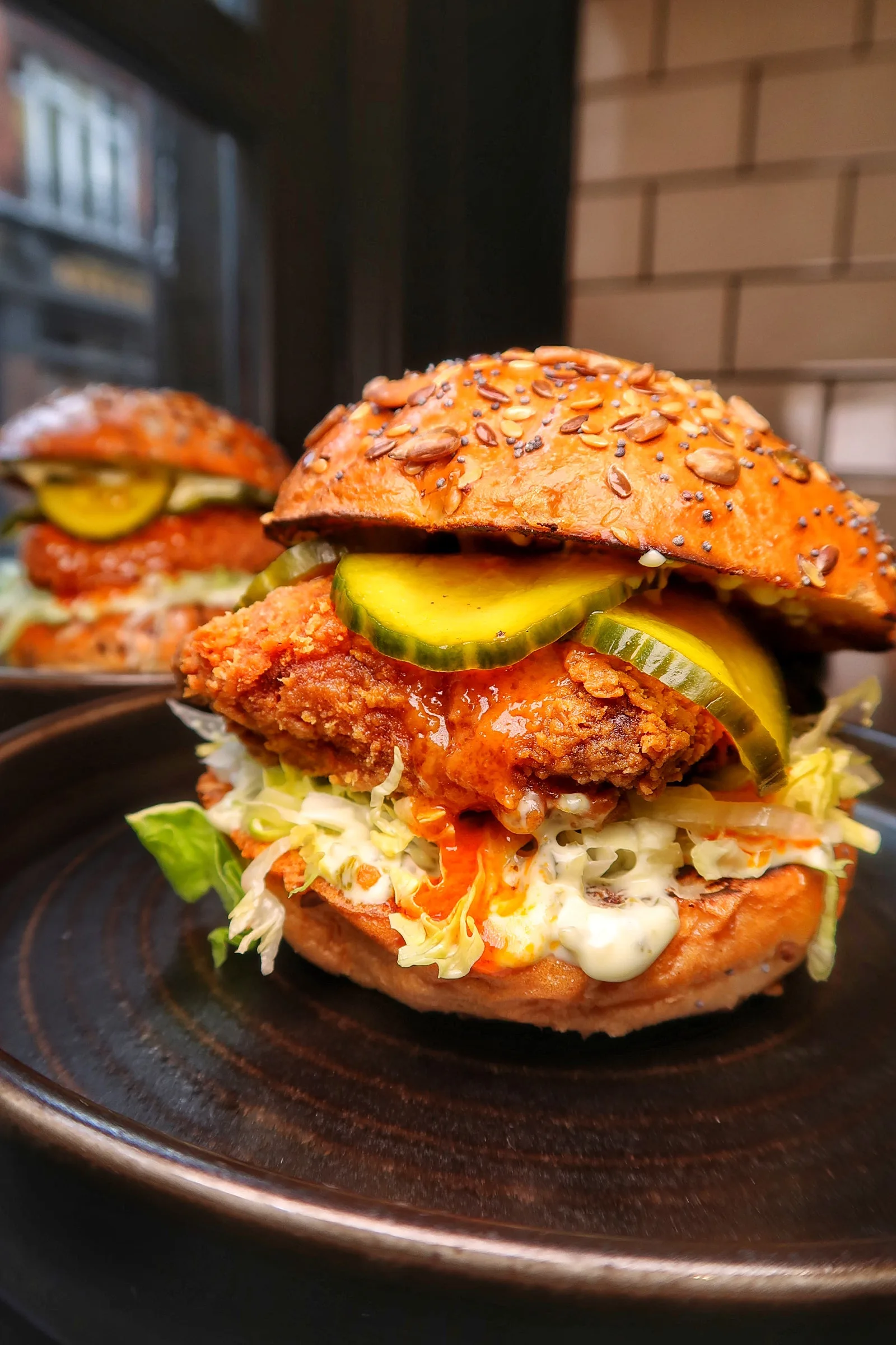 🌱Fried soya “chicken” fillet with Umeboshi buffalo sauce, candied jalapeño mayo, house pickles, shredded lettuce