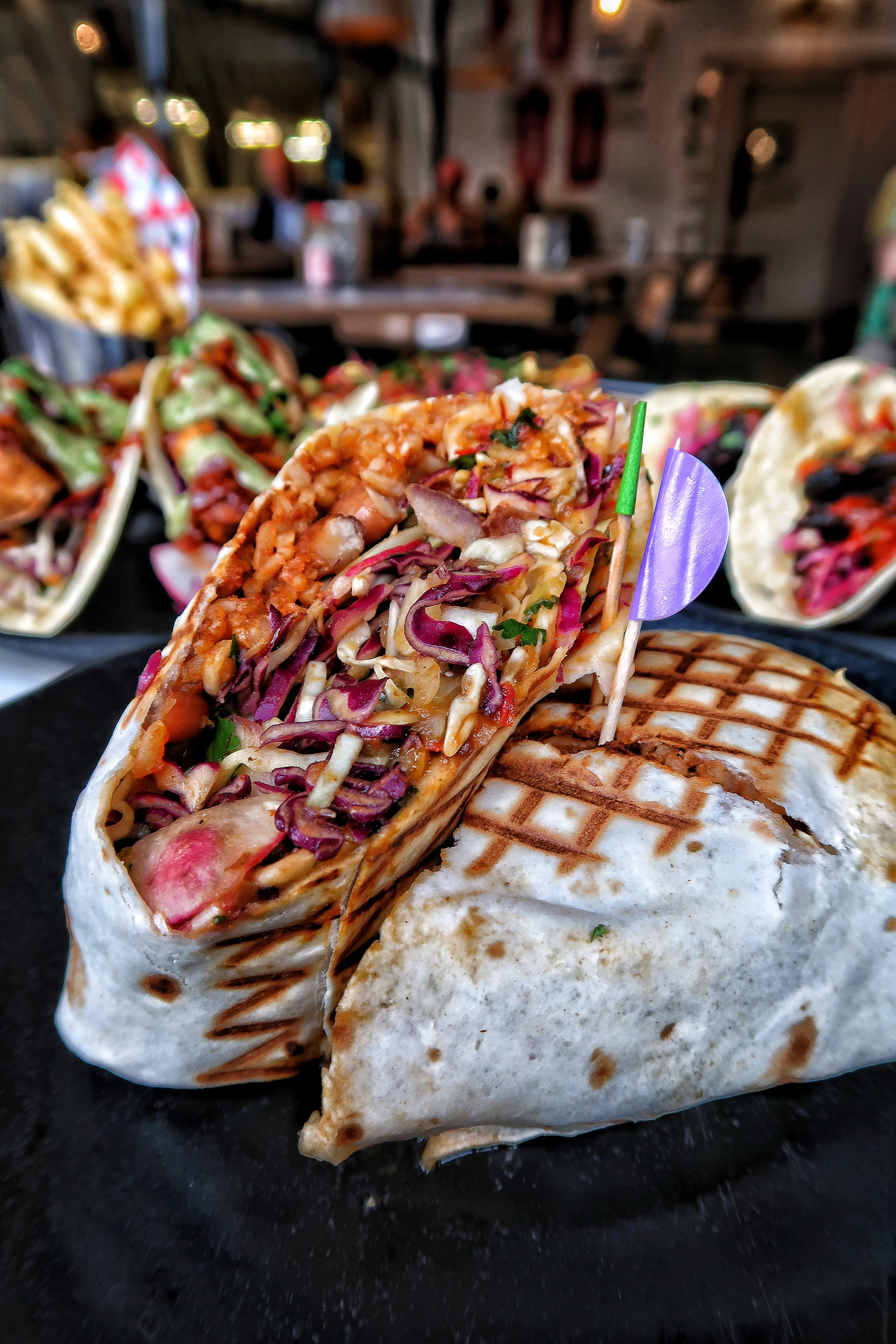 🌯 Burrito with roasted courgettes & peppers, sweet onions, avocado salsa, red pepper salsa, house pickles, guacamole – This sadly didn’t do it for me as it was more like a salad wrap than a burrito but it could be improved by taking out some of the slaw and veg and adding more rice and beans, and maybe some tofu/seitan