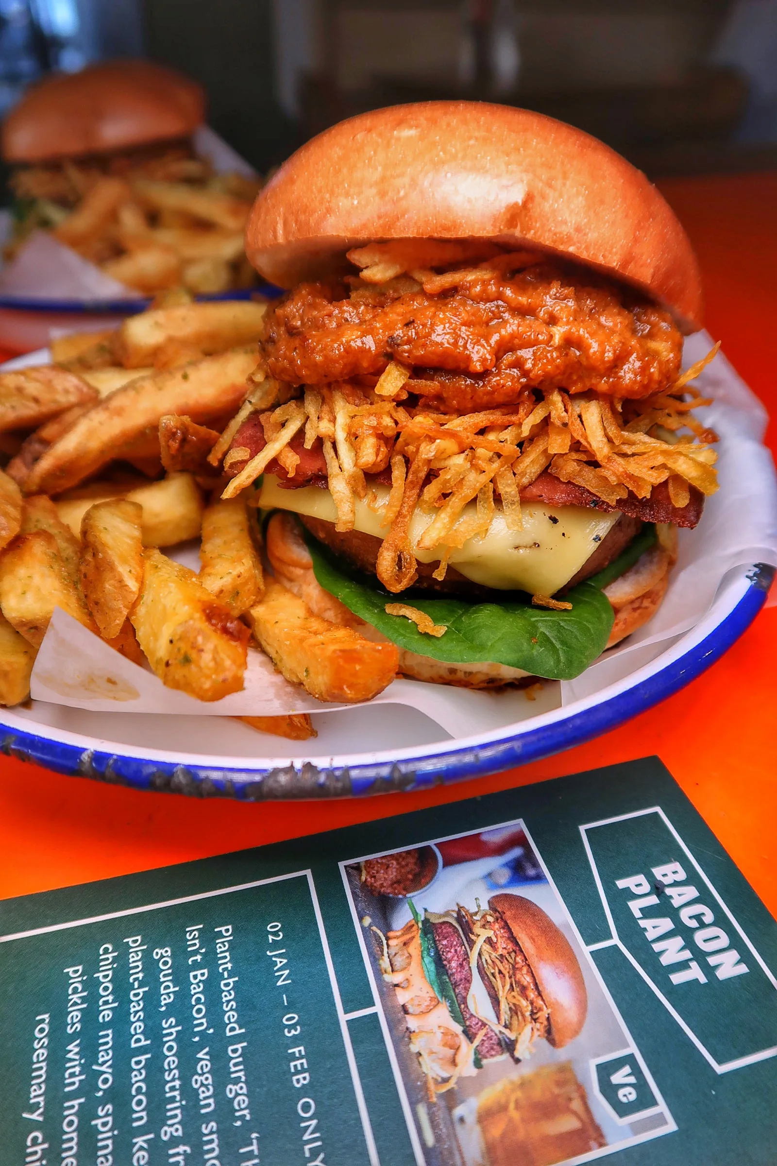 💭I was wary about trying this. The plant burger is so dear to my heart and I didn’t even really used to love bacon in my burgers back in my meat-eating days, but ohhhh lawdy, I needn’t have feared 😱 This is an absolute cracker of a burger 👏🏼 It’s bigger than the original which I like 🍔 It’s more filling but still leaves you feeling lighter than after a meat burger 👍🏼 It’s got the same flavours as the original but they’re stronger! 🤤 The bacon & bacon ketchup ensure it’s much smokier 🔥 The bacon is also just the right thickness so it doesn’t dominate or detract from the flavour of the patty 👏🏼 It’s juicy, creamy, meaty and squishy – Just like a burger should be 😍 The cheese melts well and the shoestring fries add a perfect crunch 🤤 The pickles are heavenly. The flavours are just to die for 😍 I really honestly struggled to find fault with this. the only thing I’ll say is that the chips are usually I incredible but these were lacking rosemary 😔