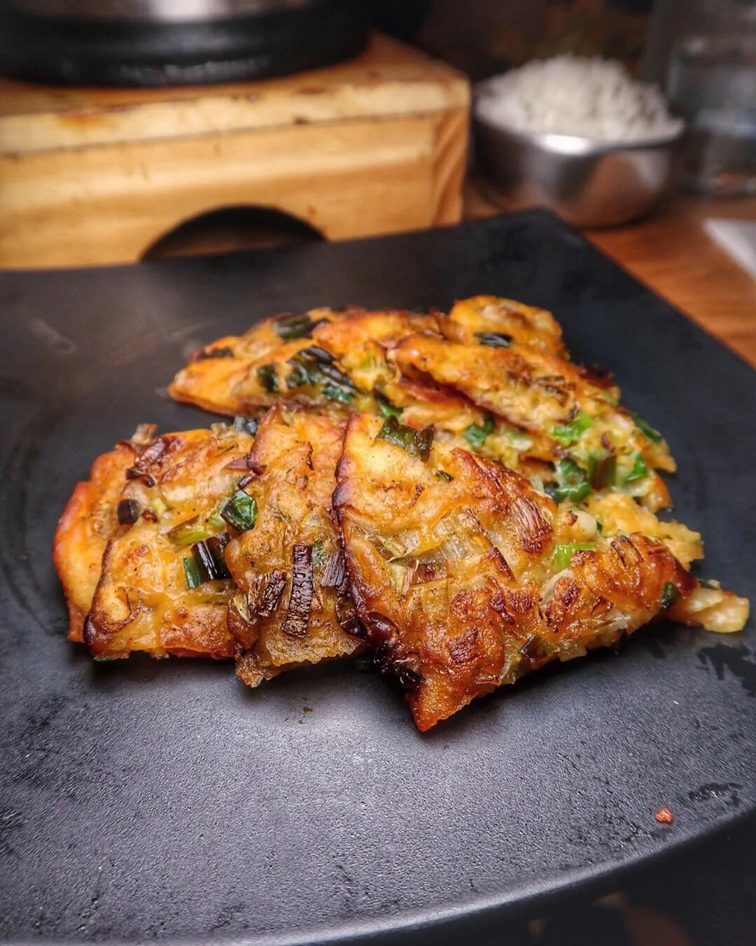 🌱Kimchee Jeon – Savoury kimchee pancake topped w/ spring onions, served w/ soy sauce & apple cider vinegar 💰 £6.90