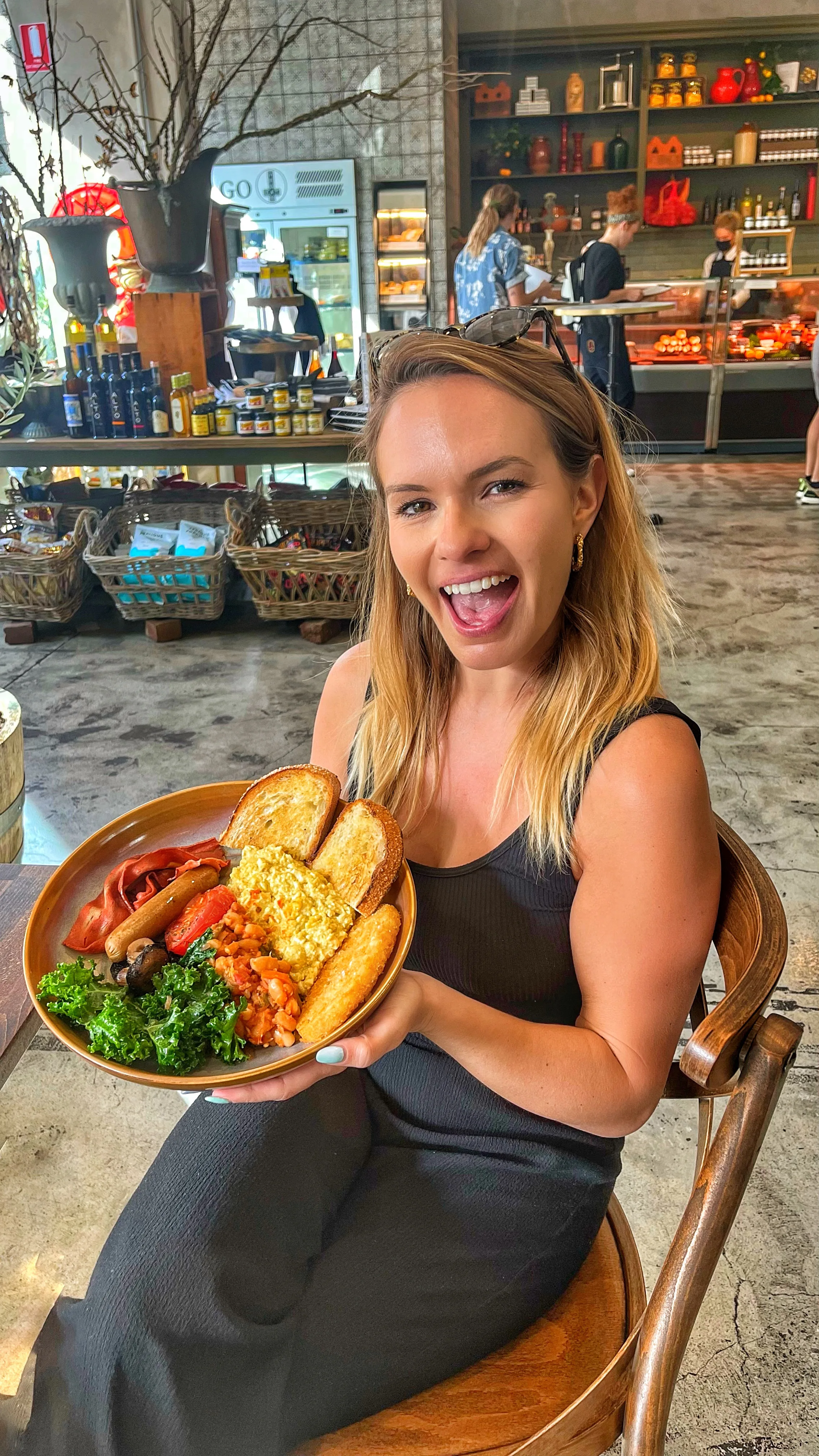 Me holding a plate with a vegan full english breakfast including hash browns, toast, scrambled tofu, sausages, bacon, tomatoes, kale, mushrooms and beans