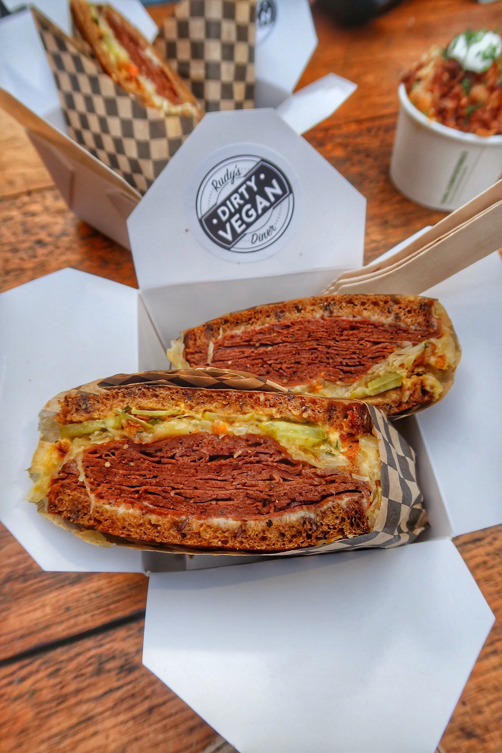 🌱Rudy’s Reuben w/ seitan pastrami, cheeze, onions, chives, cashew nut cheeze pickles, Russian dressing on rye