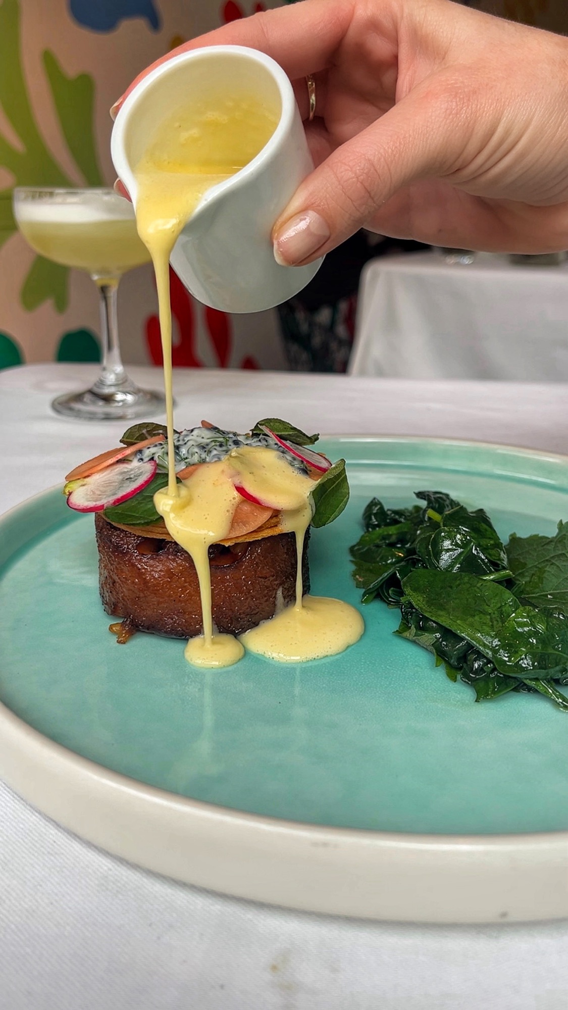 💭This is exactly how I pictured a summer menu – light, fresh and flavoursome. The highlight for me was the sushi – especially the “meat” and “caviar” option. The rice was warm, soft, fluffy and well seasoned and the meat was cut thinly which gave the sushi a subtle bite but lots of flavour. I don’t know why so many places refuse to offer creative sushi but Alexis has shown them all up here. The lemon falafel was really nice – fresh and zesty but I would’ve liked some kind of dip to accompany it. I loved how fresh the pea tartellettes was. I’m not sure kohlrabi is my jam sadly but I still appreciated how creative this dish was. The artichoke dip was really tasty – one for the garlic lovers because they do NOT hold back on the garlic! Anything rich and creamy is a bit of me so the spring more tortellini was right up my street. Delicious drinks and tasty desserts. My only feedback on the dessert is that I would’ve liked it to be a bit lighter and less dense to finish off the fresh spring menu. I’d definitely come back here – it’s a nice venue and an enjoyable way to experience fine dining without splashing out £100pp. They also offer a wine pairing option and during the day, a bakery where you can grab vegan pastries and more lunchtime style dishes like sandwiches.