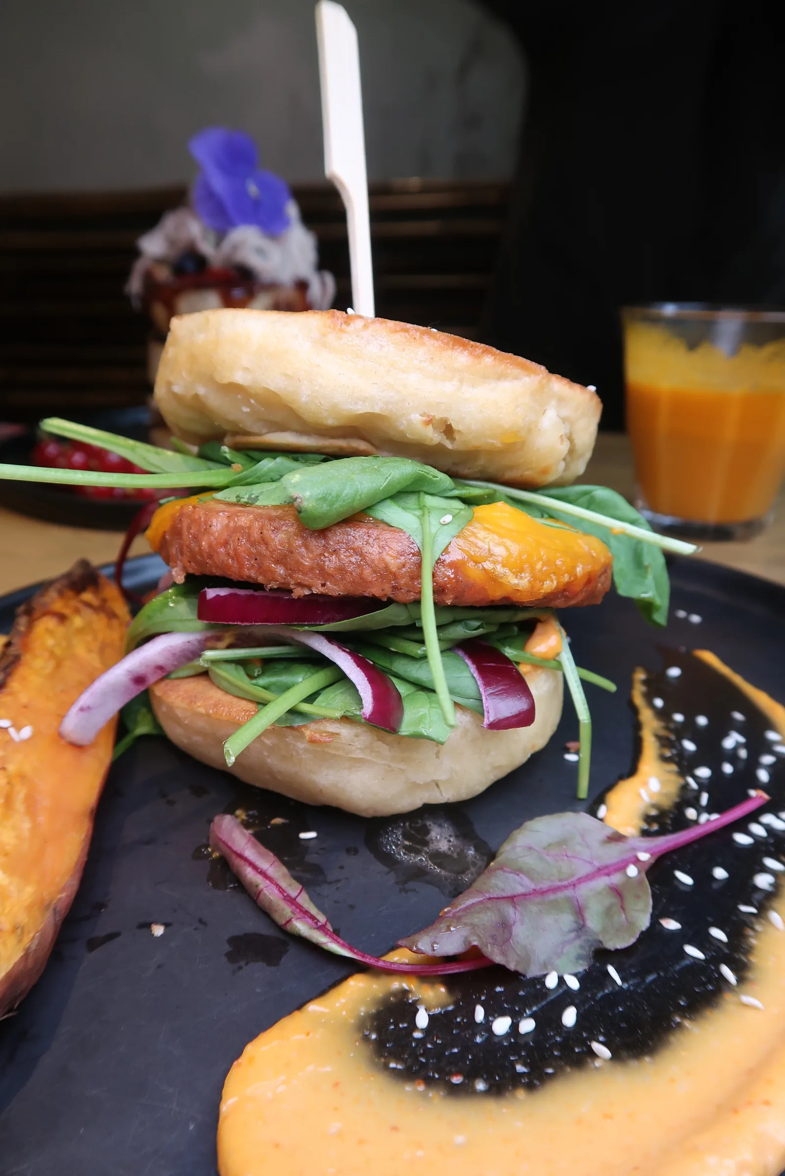 - Vegan Burger with 2 pancakes, vegan cheese, mixed green salad, fresh tomatoes, vegan spicy sauce, sweet potatoes and avocado salad – 14 euros (£12.10)