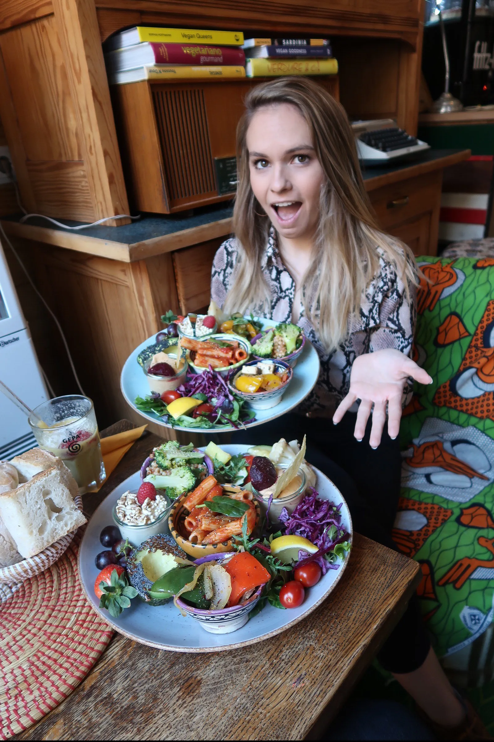 - Afro-Italian Brunch which comes with a giant plate full of fresh, healthy food including tomato pasta, pearl barley, fresh fruits and veggies, the most divine hummus, vegan yoghurt etc. – 13 Euros each