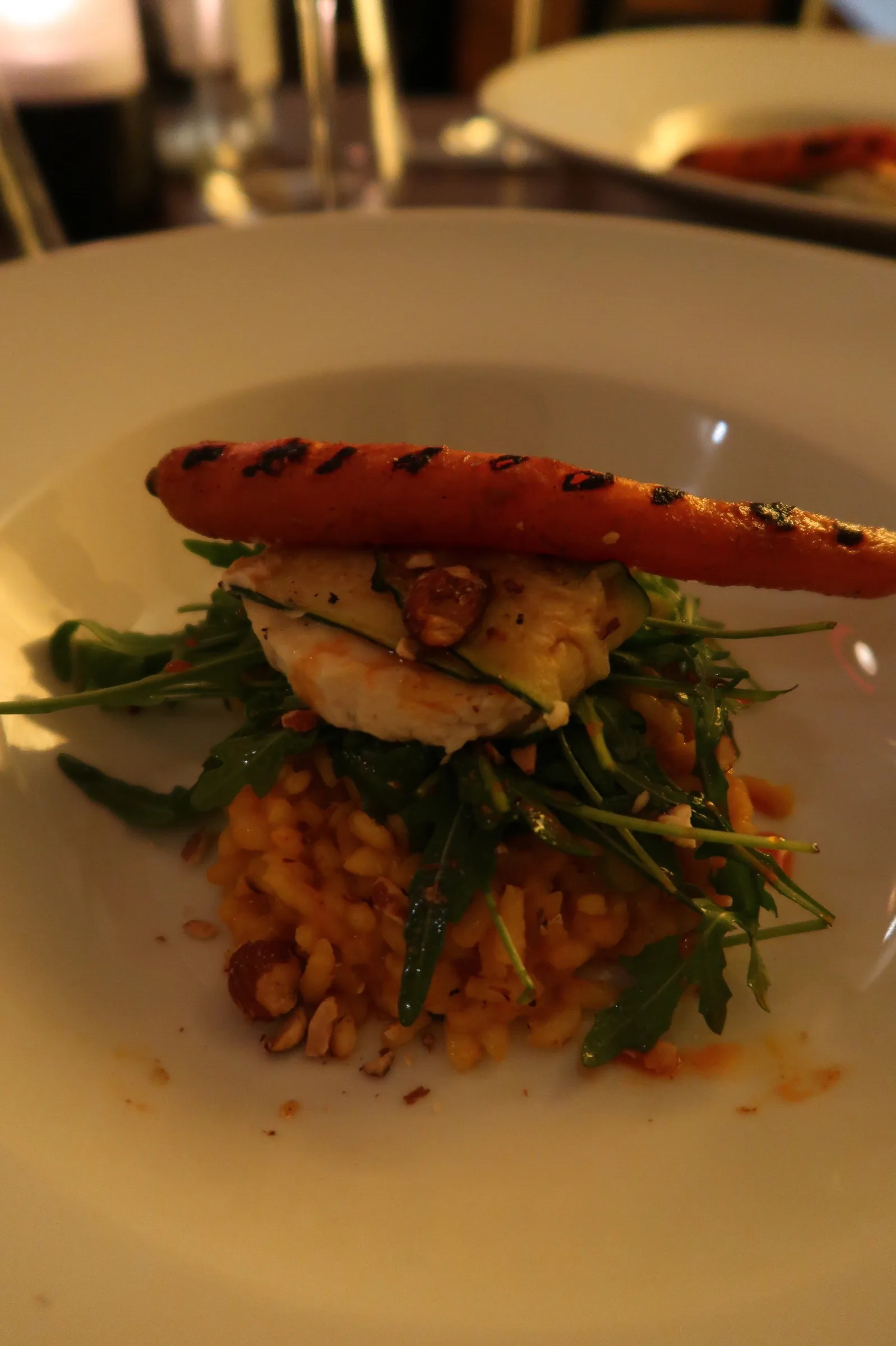- Entree: Carrot risotto, buccola, roasted vegan feta and salted almonds