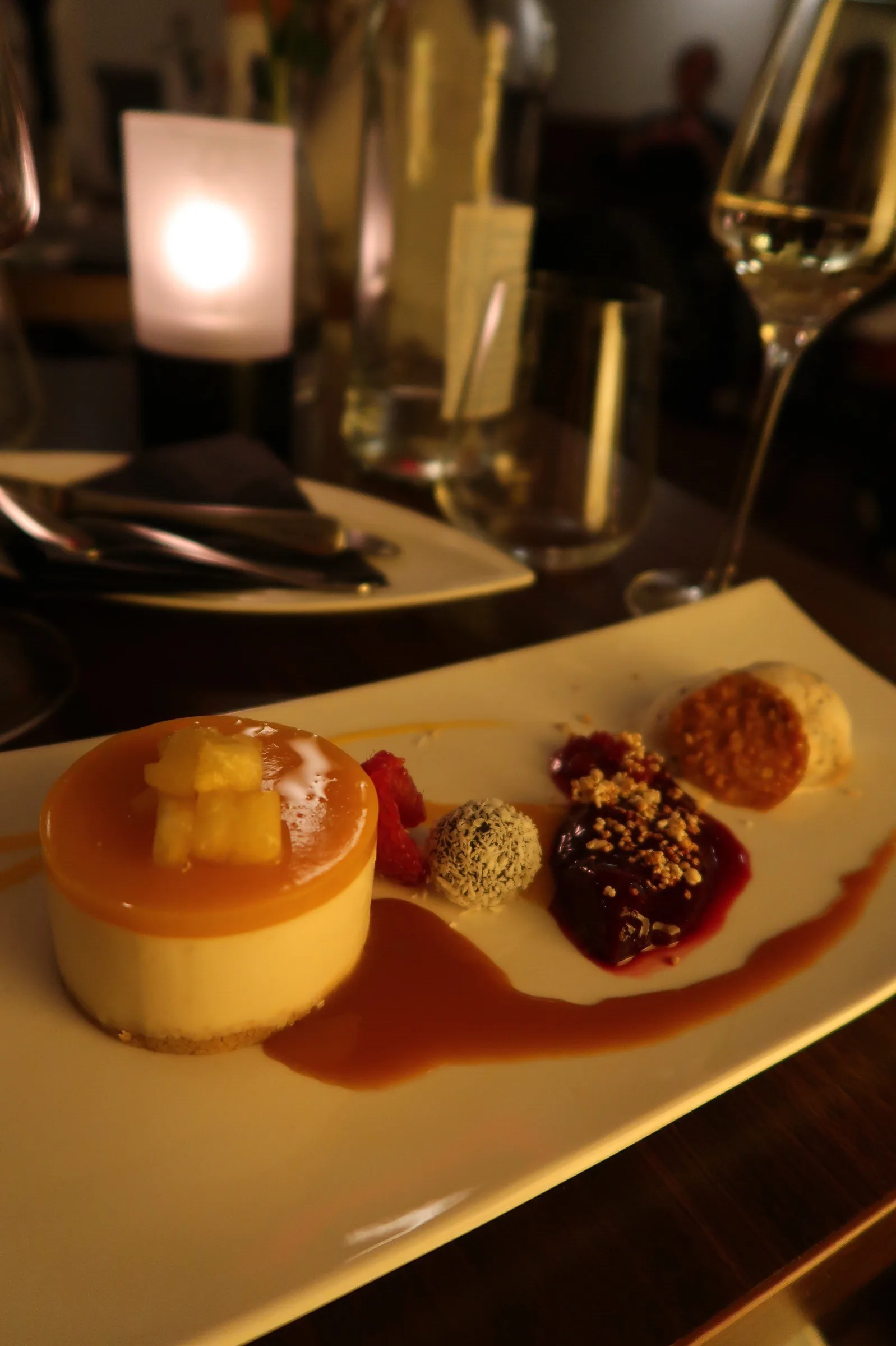 - Dessert was your choice of either farina pudding with chocolate crumble, raspberry and plum ice cream OR a cheese board with chutneys and jams (we ordered one of each)