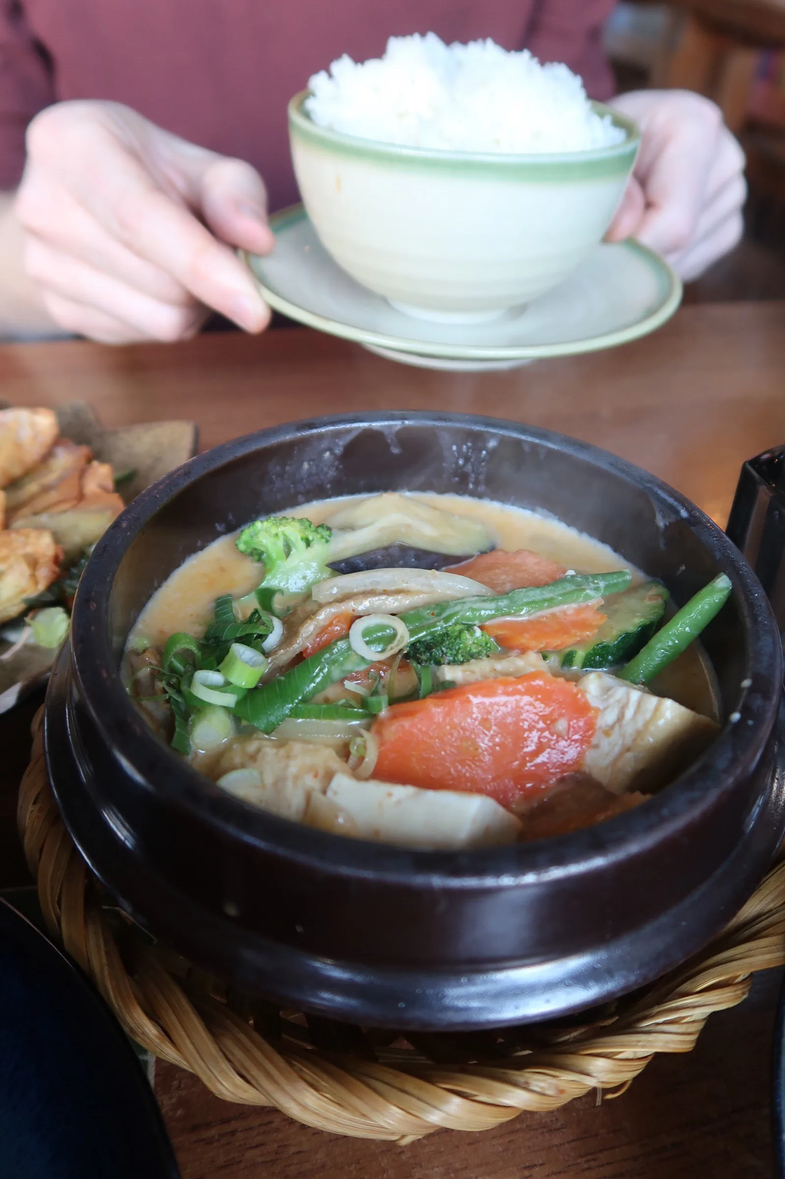 - Cari – Homemade curry made from spicy red curry coconut sauce in a clay pot with soft silk tofu, spicy seitan and fresh veggies with rice