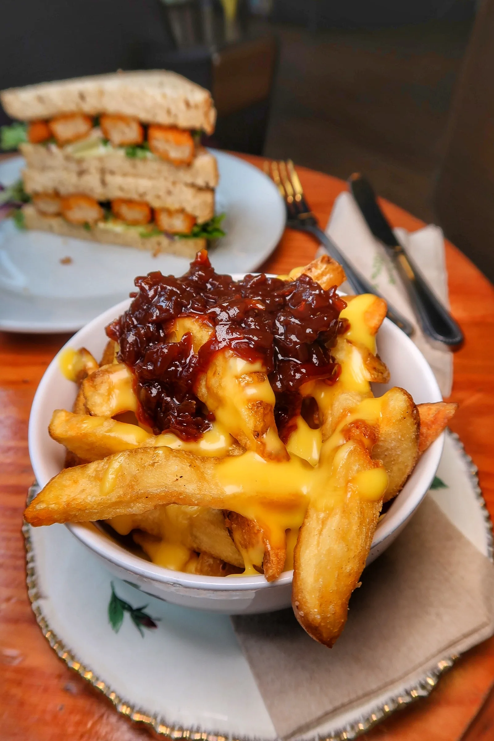 - Loaded chips with vegan cheese and a red onion chutney – £5