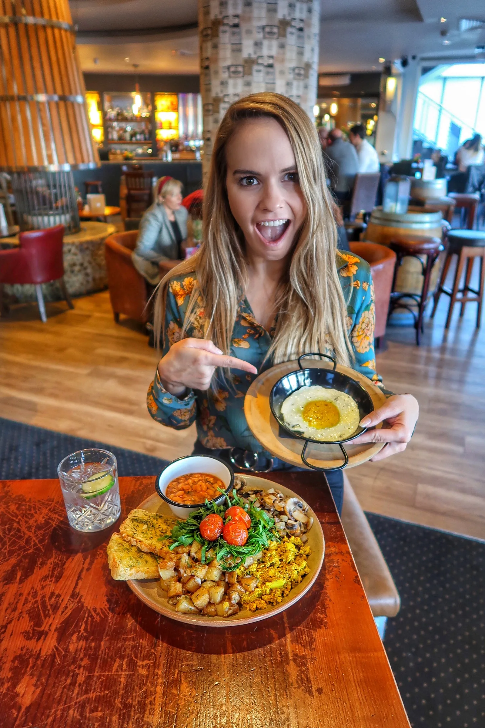 • Brunch of champions – Homemade cheese loaf slices, sausage patty, scrambled tofu, garlic & herb parmentier, mushrooms, onions, cheery tomatoes, spinach & baked beans. We also added a fried egg for £3  which made the total £16.50