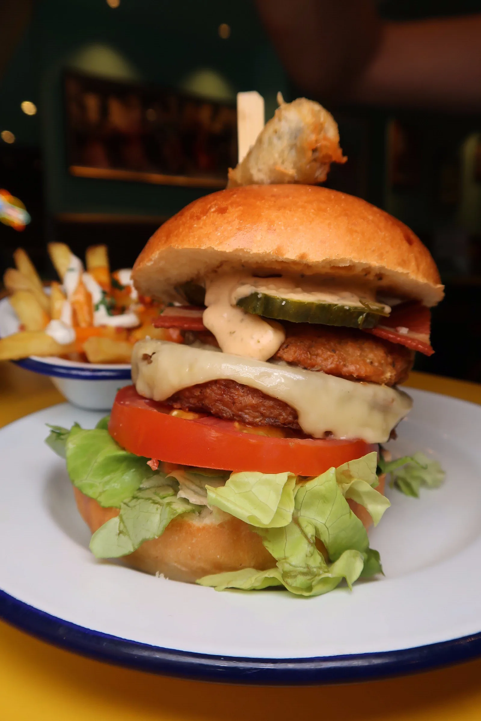 - The Macatomi Plaza Burger w/ beyond meat patty, breaded deep fried Mac & cheese patty, smoked vegan gouda, double baecon, house sauce, pickles, lettuce, tomato – £15.95