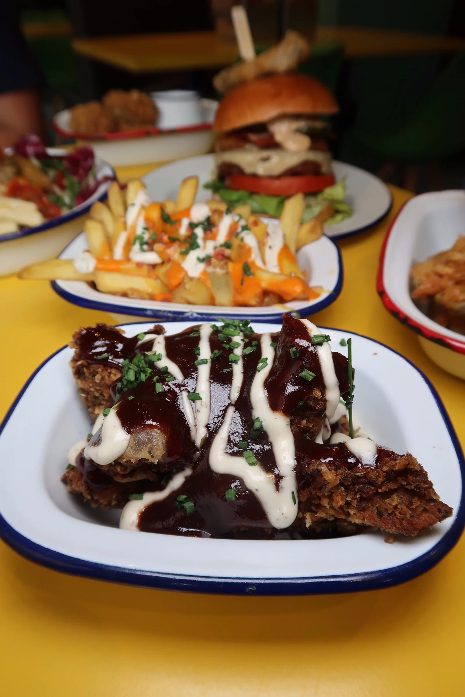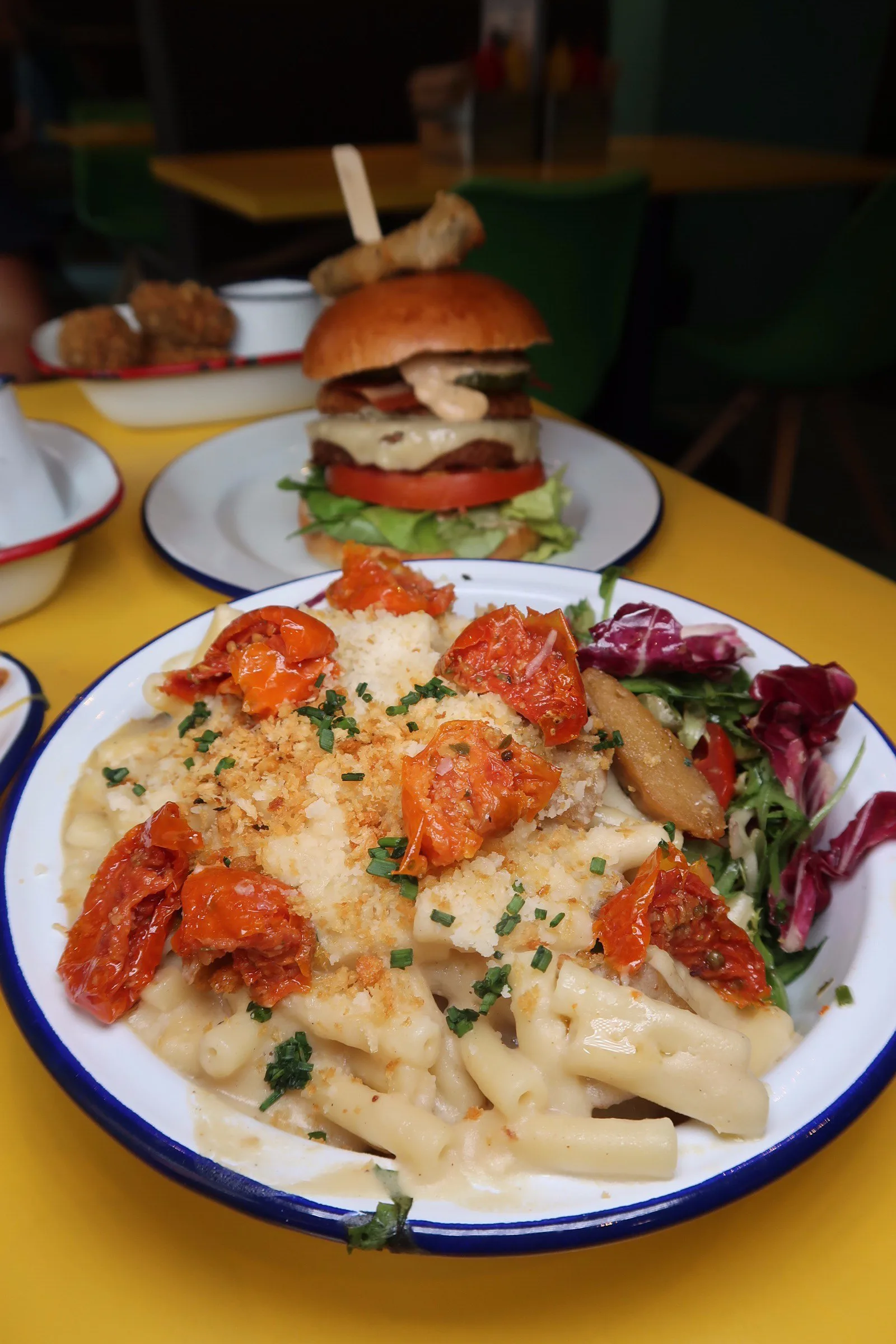 This is a huge vegan “junk” food diner in the heart of the Northern Quarter. The space itself is colourful and relaxed. It was fairly busy when we visited but not overwhelmingly so. It was easy to get a table and the staff were helpful and attentive. The menu is full of burgers, hot dogs, macaroni cheeses and deep fried goodness. This is definitely food for the soul!