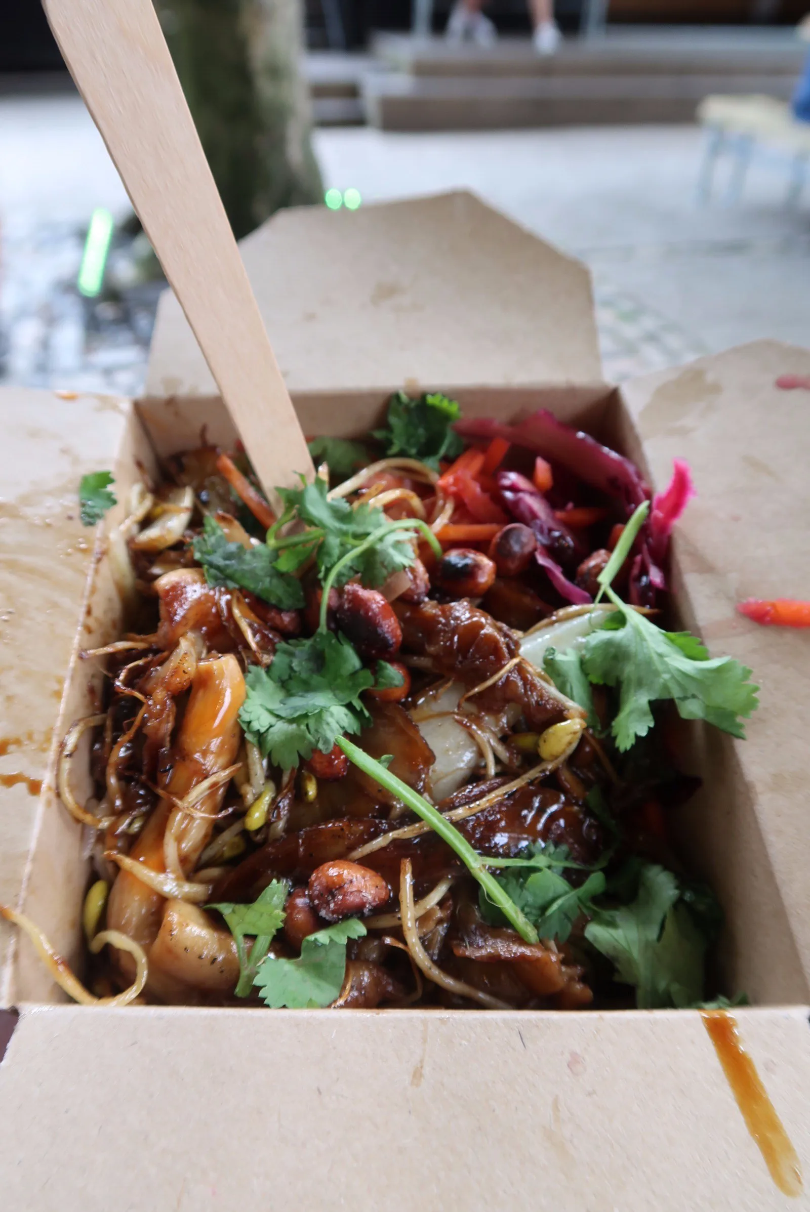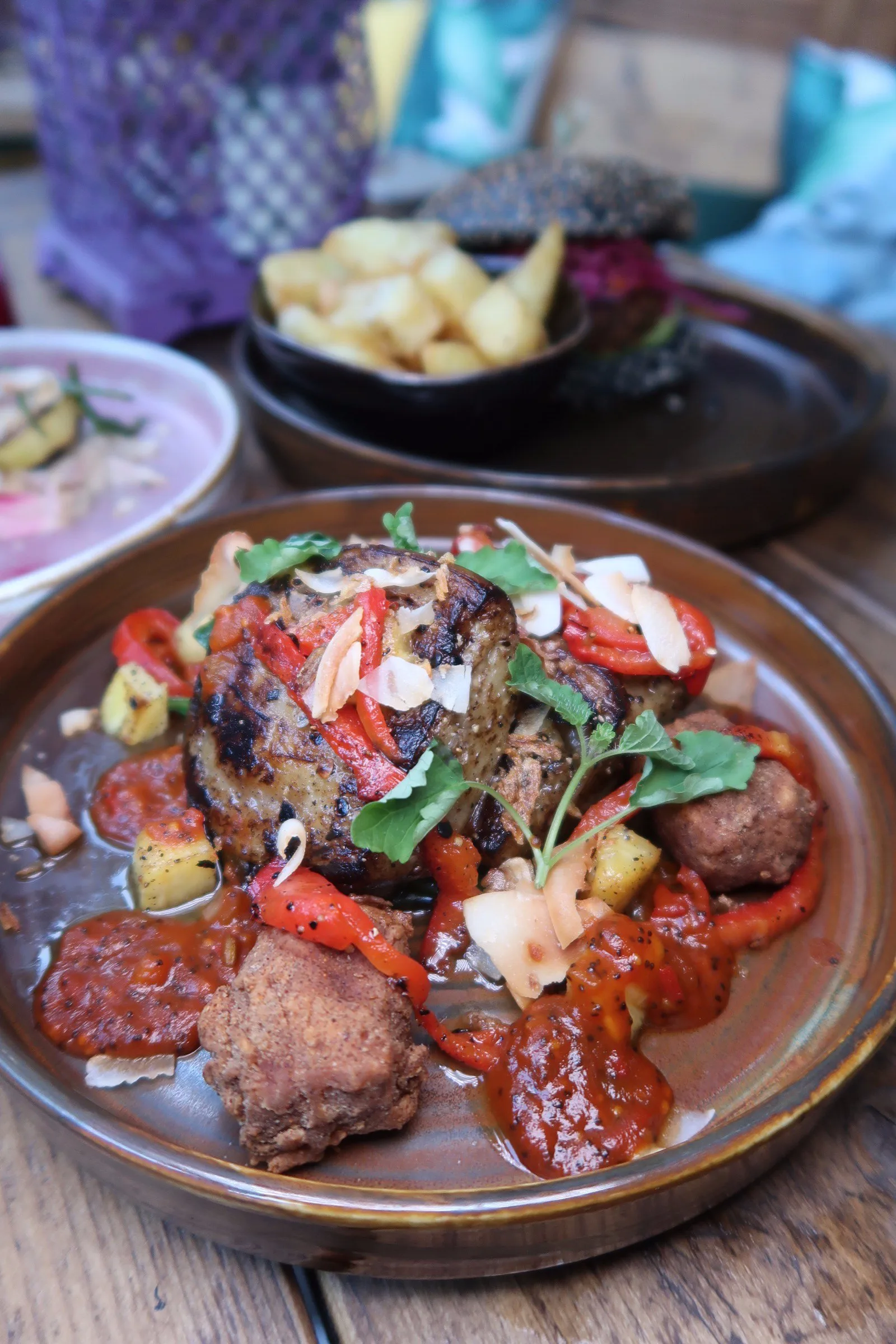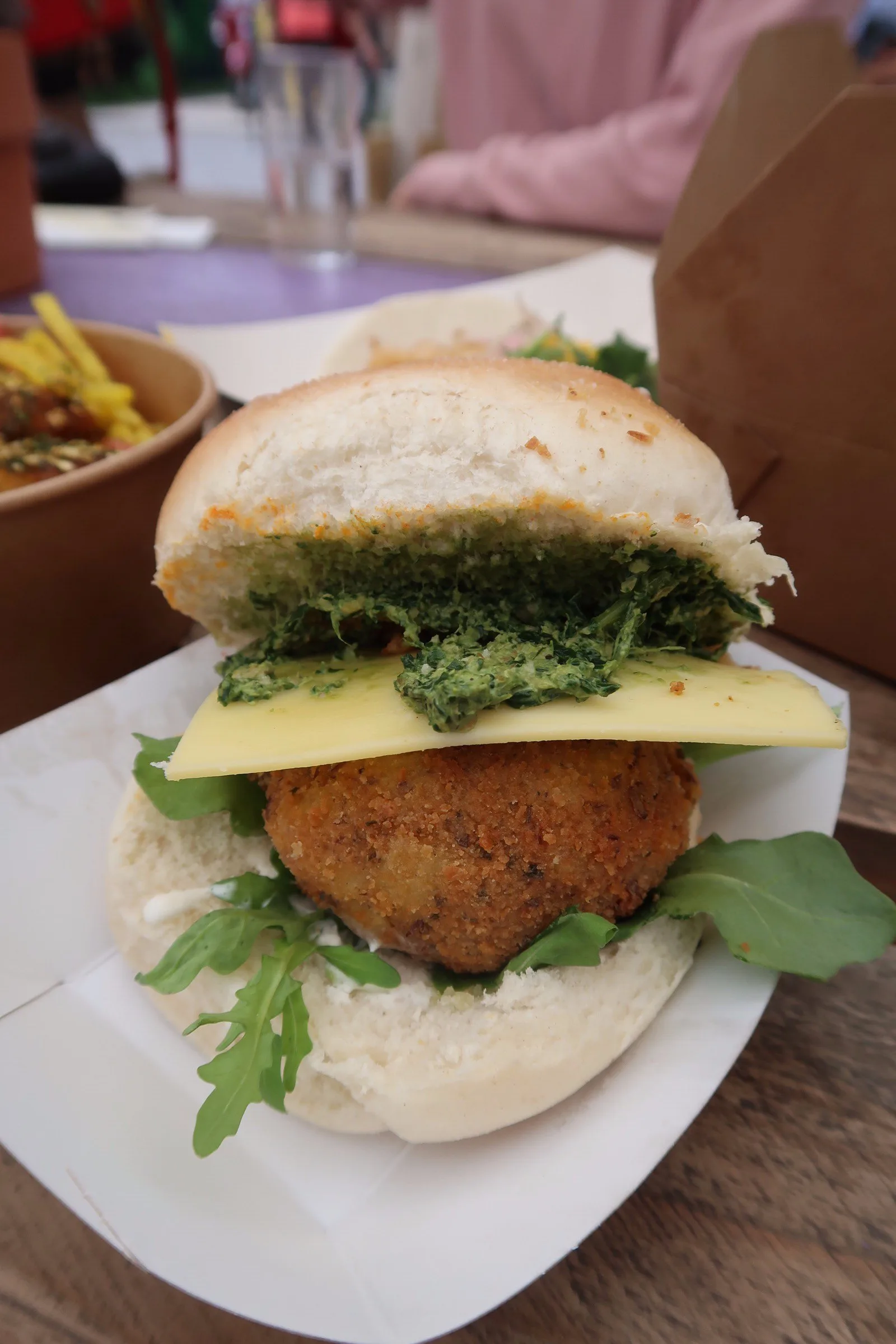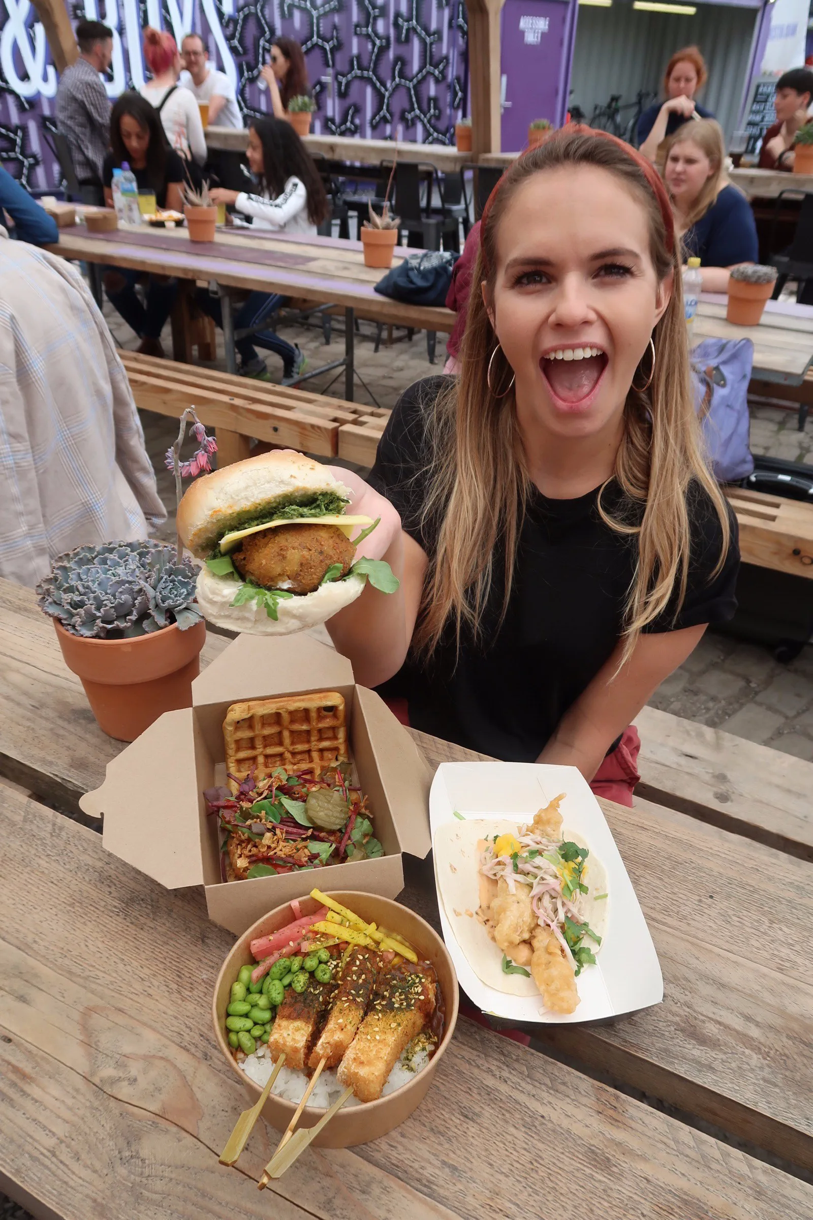 Hatch is a street market with a range of shops and food vendors. I absolutely loved the vibe – house music, street food trucks, sustainable shops and bars. I could have sat here all day (we almost did) and watched people walk by whilst munching on different types of food. There weren’t many vegan only stalls, but most of the stalls had at least one vegan option. This was dog friendly, family friendly but also the kind of place you could come in the day or the evening for drinks with a friend, or even a date. Very cool!