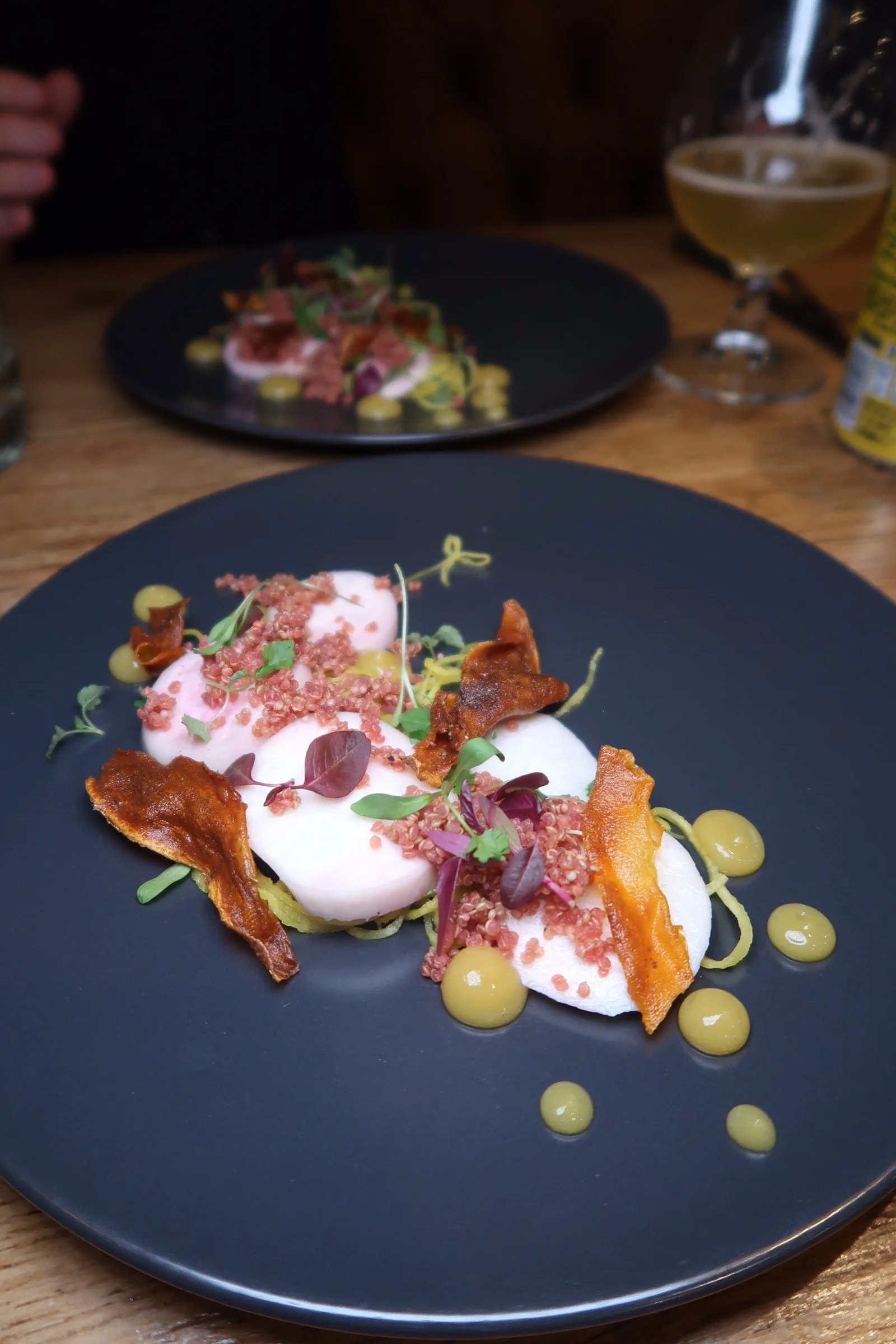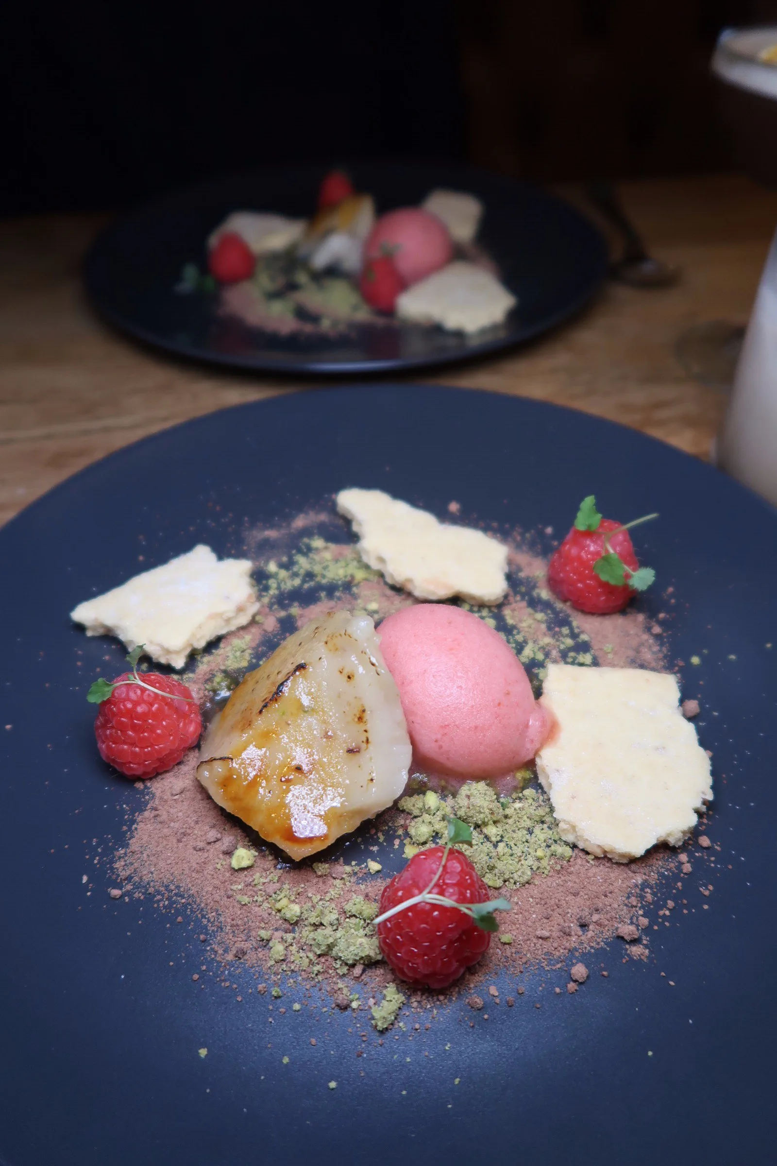 - I won’t take you through every dish as we’ll be here all day but this was a really interesting menu. It’s great to find a place which focuses on natural ingredients and also makes a real effort to experiment with combinations of textures and flavours. I don’t personally think that all of the dishes totally worked but some did, and others really intrigued me! My favourite dishes were the soup, the confit carrot, the beer battered banana blossom, the coconut, rum & pineapple, the creme brûlée and the chocolate fudge. I’d definitely go back here and I have a lot of respect for the chefs who are really pushing the boundaries with vegan cooking.