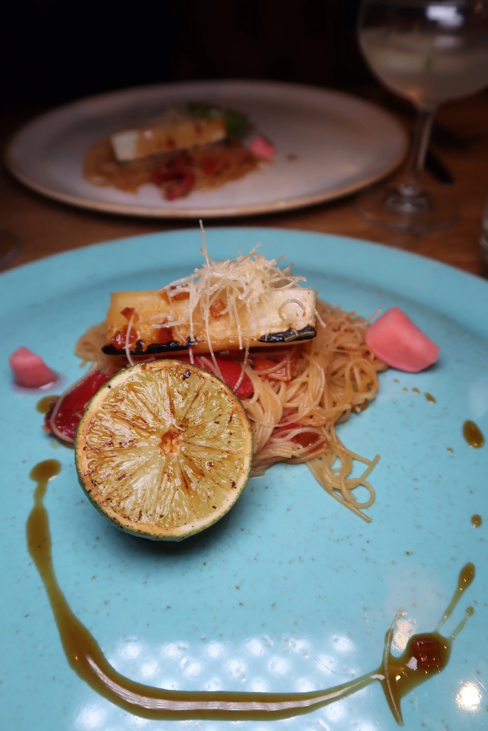 - Aubergine Fillet with pineapple, smoked tofu, roasted pepper, Korean sweet & sour, coconut & crispy shallots – £6.50