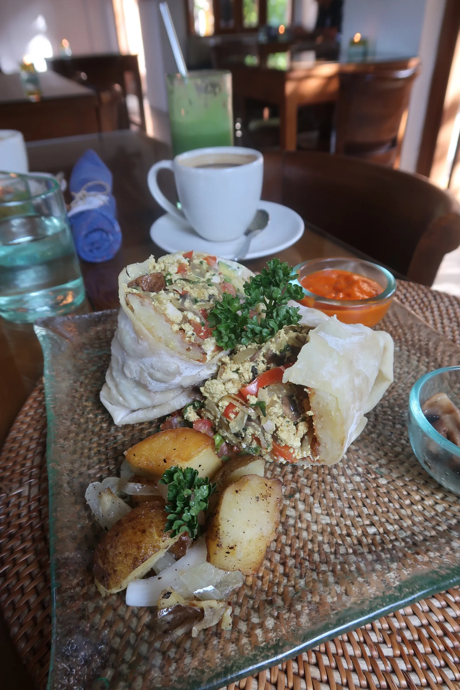 This is a beautiful restaurant! You enter through a circular wooden door and once inside, you’re greeted by water fountains and plants. We visited for breakfast and whilst the vegan menu wasn’t huge, the dishes they did have were quite tasty.